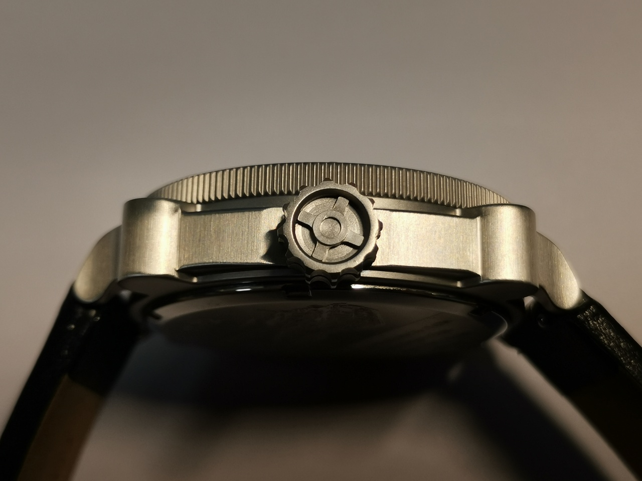 И немного критики выражу по отделке корпуса часов. Декоративные выступы имитирующие крепления прибора к основанию, проработаны с недостаточной детализацией. Вероятно, при формировании корпуса методом горячего штампования, не было оказано достаточно давления для заполнения металлом всех уголков формы, особенно периферийных. После обработки корпуса под сатинирование, непроработанные детали выглядят отличающимися по текстуре «зализами».