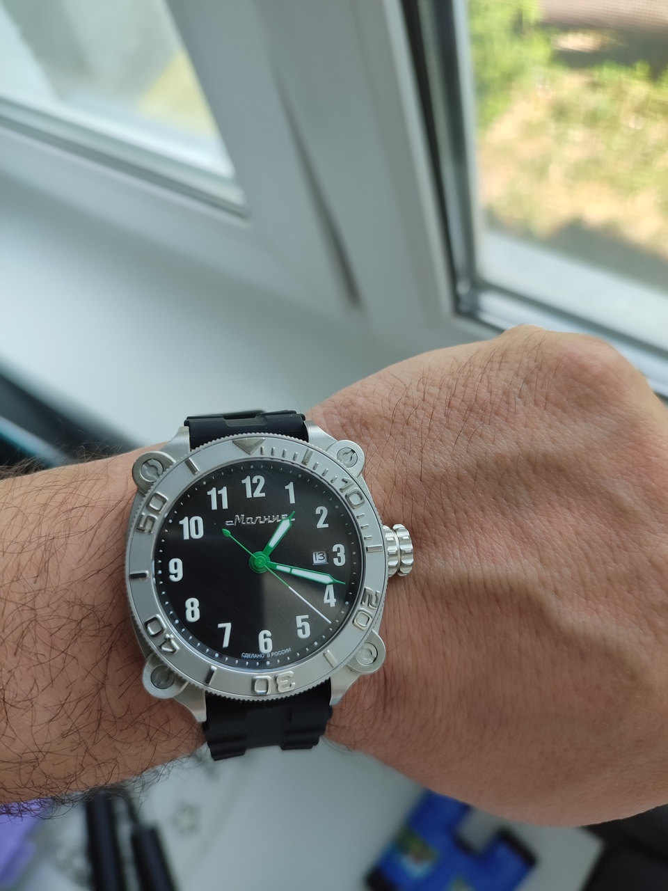 Итак, что мне понравилось в этих часах: Очень интересный дизайн корпуса с декоративными элементами напоминающими выступы для крепления прибора к стационарному основанию. Объёмный безель в стиле «Яхтмастера» довольно гармонично вписывается в общую картину. Все надписи на корпусе часов, циферблате, бакле ремешка, выполнены кириллицей на русском языке, что несколько подогревает патриотические чувства. Часовая разметка привлекает внимание красивыми накладными, и даже несколько парящими над полем циферблата белыми арабскими цифрами. Шрифт часовых меток без засечек, сильно напоминающий гротескный Haettenschweiler, эпохи промышленного дизайна 1960х-70х годов.