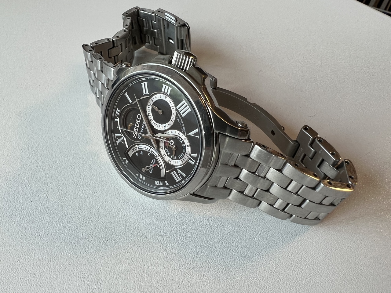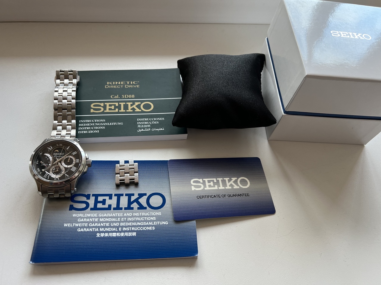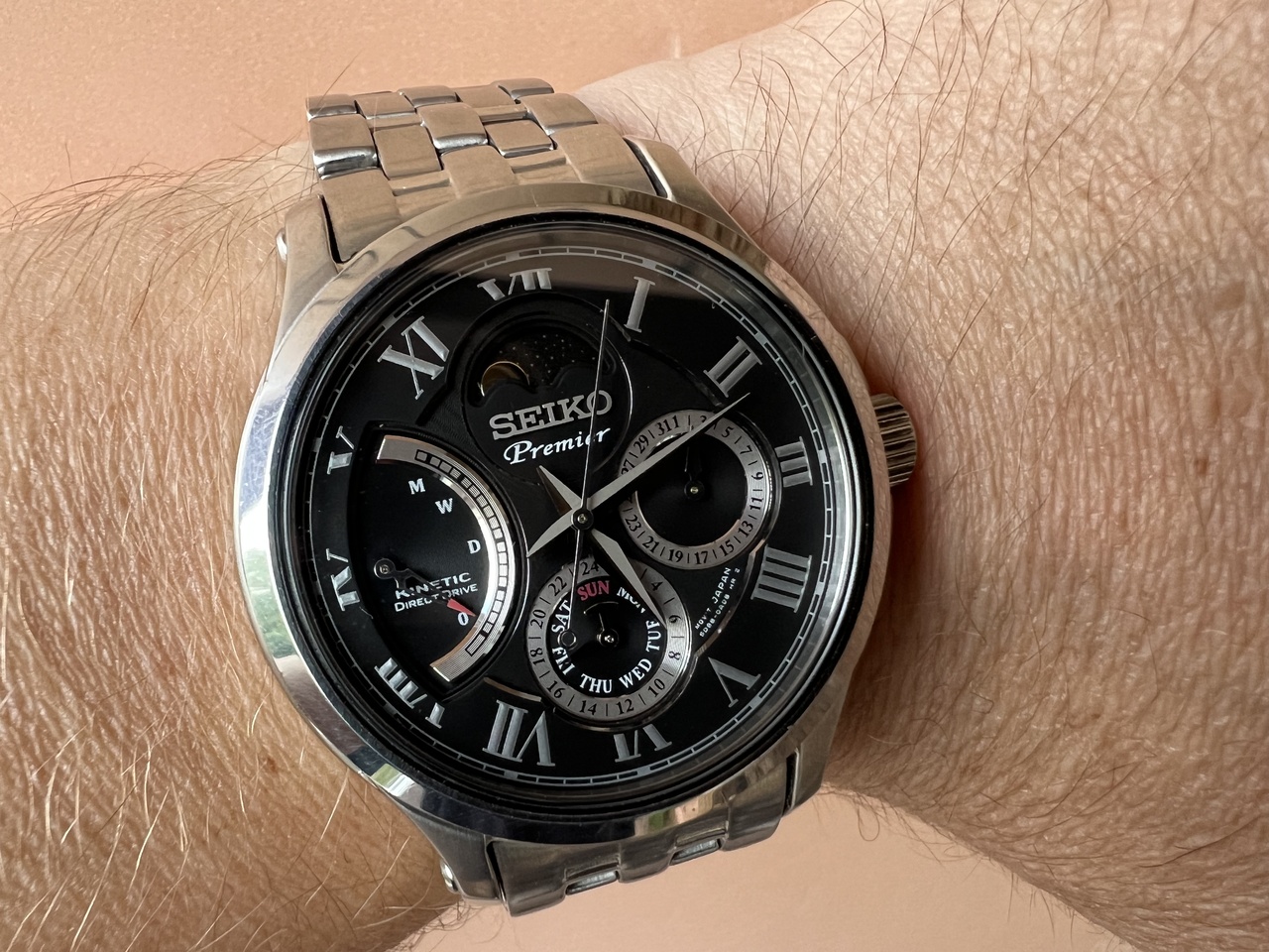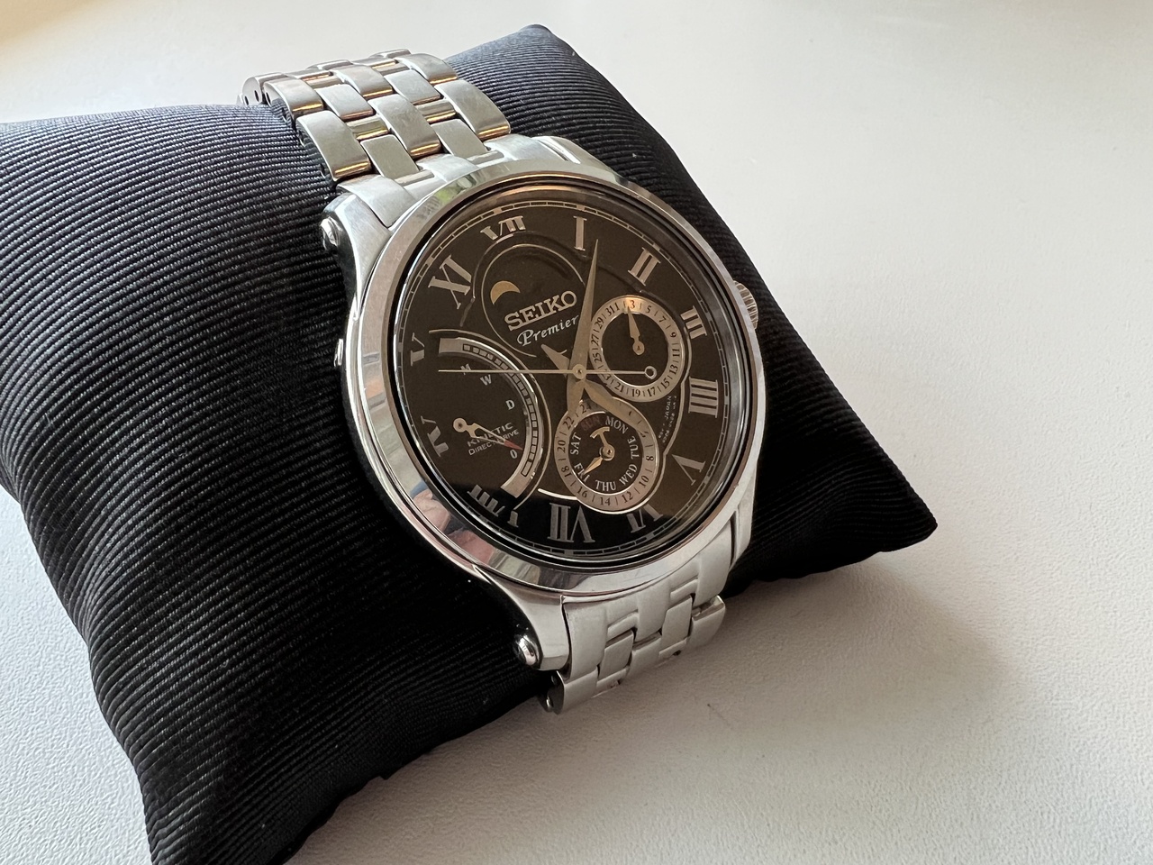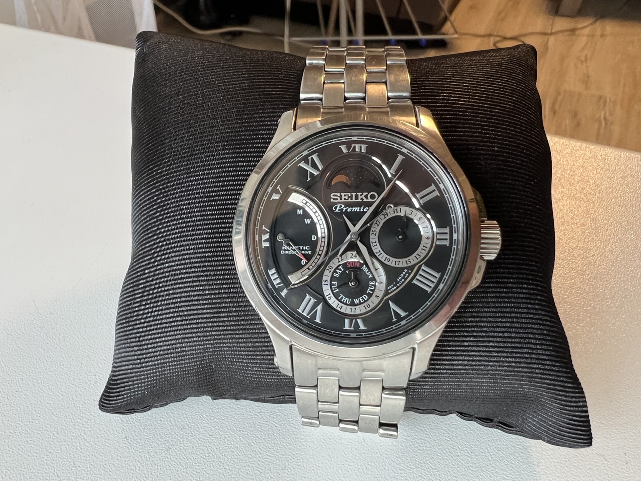 Представляю Вашему вниманию одну из топовых моделей серии Premier Kinetic Direct Drive от Seiko. Черный циферблат, стальной браслет на складной застежке, календарь, автоподзавод и возможность прямого завода с интерактивной индикацией уровня накопленной энергии, фазы луны - всё это собрано компанией Seiko в данной модели часов.