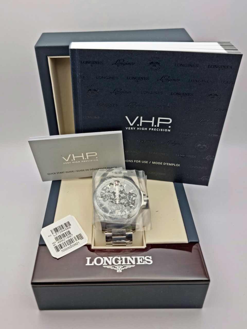 Оформление: В механизме использована технология V.H.P., разработанная ETA специально для Longines, которая обеспечивает повышенную точность хода часов, а также системы автокорректировки показаний. Антибликовое покрытие стекла, завинчивающаяся задняя крышка. Второй часовой пояс в 24-часовом формате времени. Индикатор разряда батареи