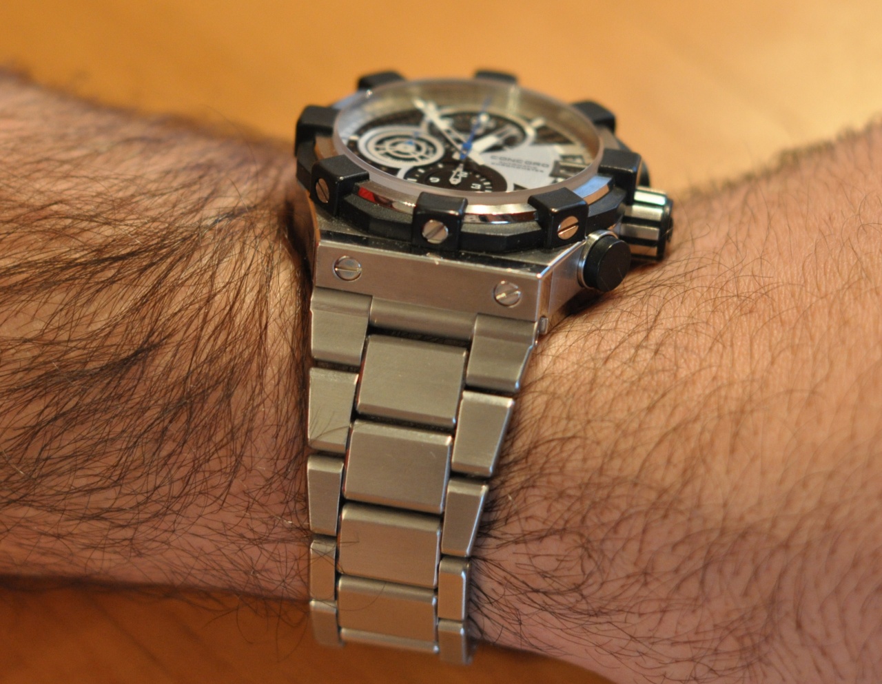 Часовые и минутные стрелки частично аккуратно покрыты до середины стрелки люминесцентным материалом, сам стрелки которые показывают часы и минуты в оригинальном ассиметричном дизайне. Часы CONCORD C1 Chronographe облегают запястья как литое сооружение и даже не ощущается его присутствие на руки благодаря специальному способу крепления металлического браслет, прекрасную обнимающую запястье подгонку, что можно так же заменить на каучук, что, на мой взгляд, правильно. Сам браслет фиксируется к корпусу часов с помощью двух пар винтов.
