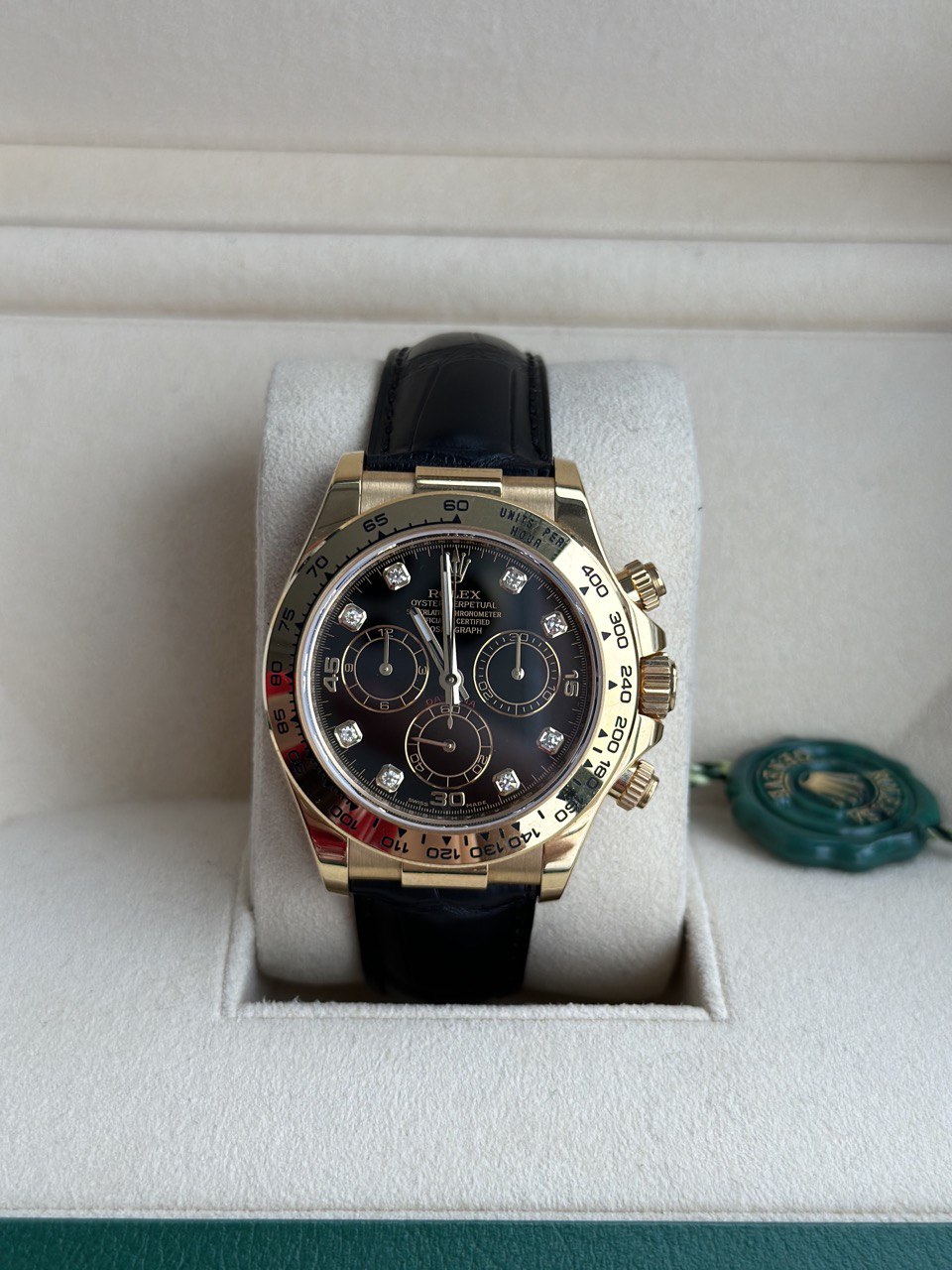 В наличии Cosmograph Daytona 40 мм из желтого золота с черным циферблатом и бриллиантами.