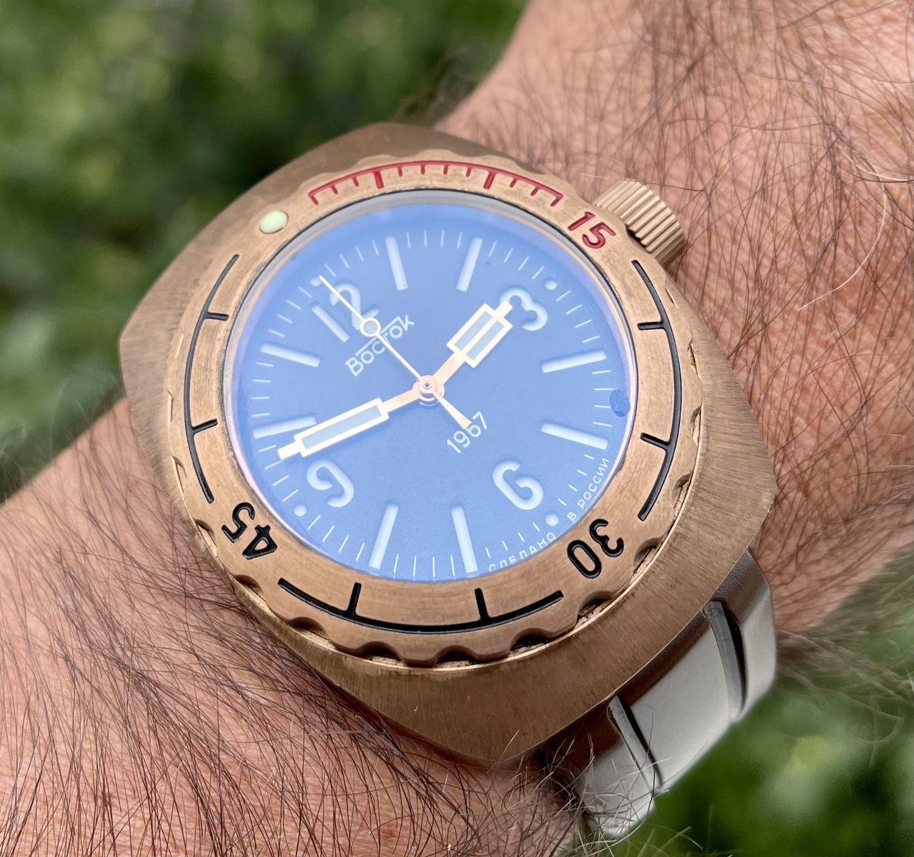 Привет, мои друзья! Я не знаю, какой процент этой модели 2017 года был заводского изготовления, но, по крайней мере, это все еще версия «Востока» и часы с настоящим калибром и классической системой заводной головки. Надеюсь, с завода его считают настоящим Востоком, и я очень горжусь тем, что он у меня есть. На бронзе образовалась очень красивая темная патина, и даже стрелки теперь немного обесцвечены… даже лучше, мне это нравится. Циферблат «сэндвич» прекрасен, а часы создают ощущение «стимпанка», создавая впечатление особенных часов. Какое мнение на форуме об этих бронзовых моделях?