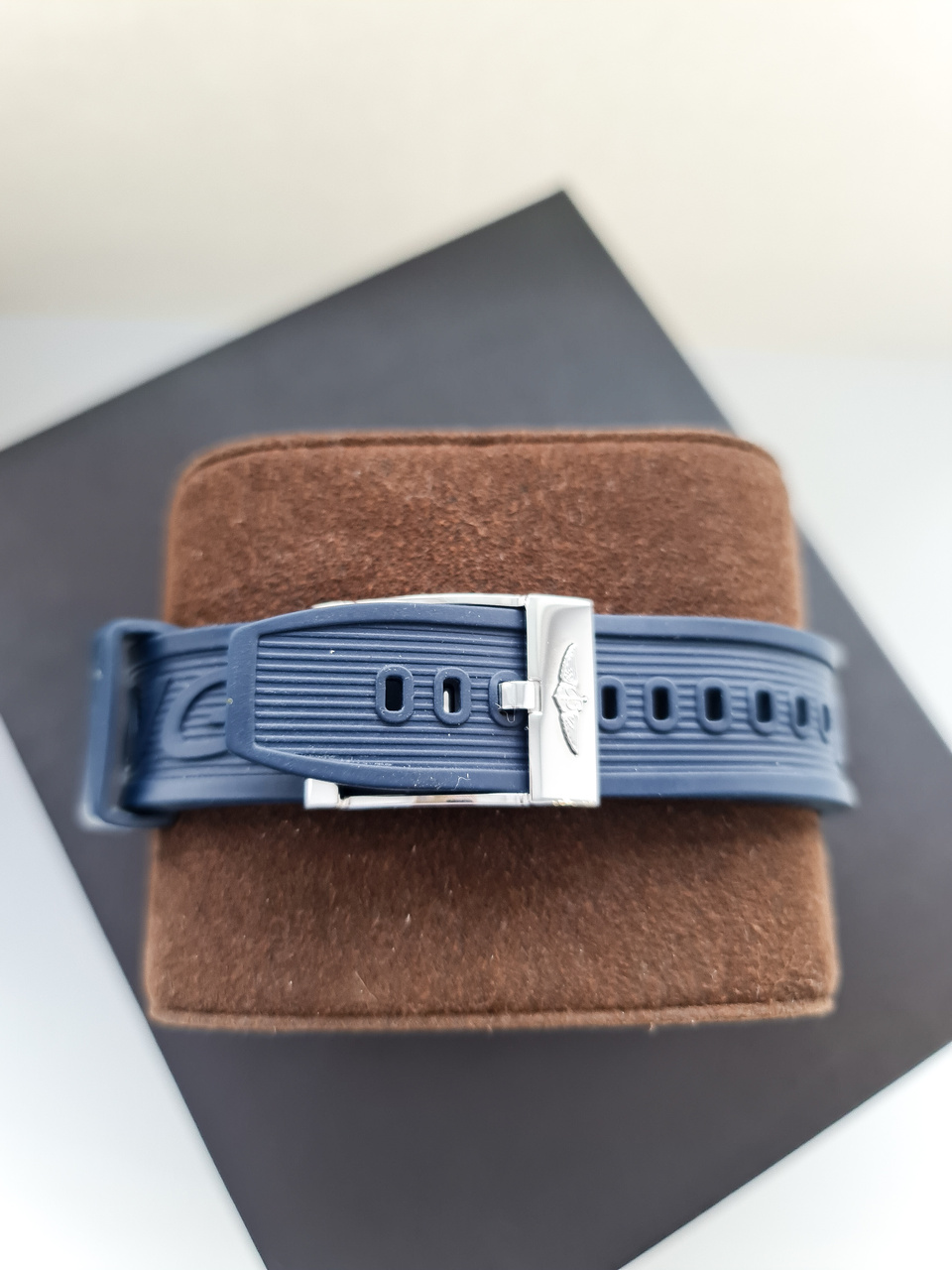 Водозащита 1000 м, гелиевый клапан, патентованная система водозащиты кнопок хронографа: кнопки магнитные, отсутствует прямая связь с механизмом.
