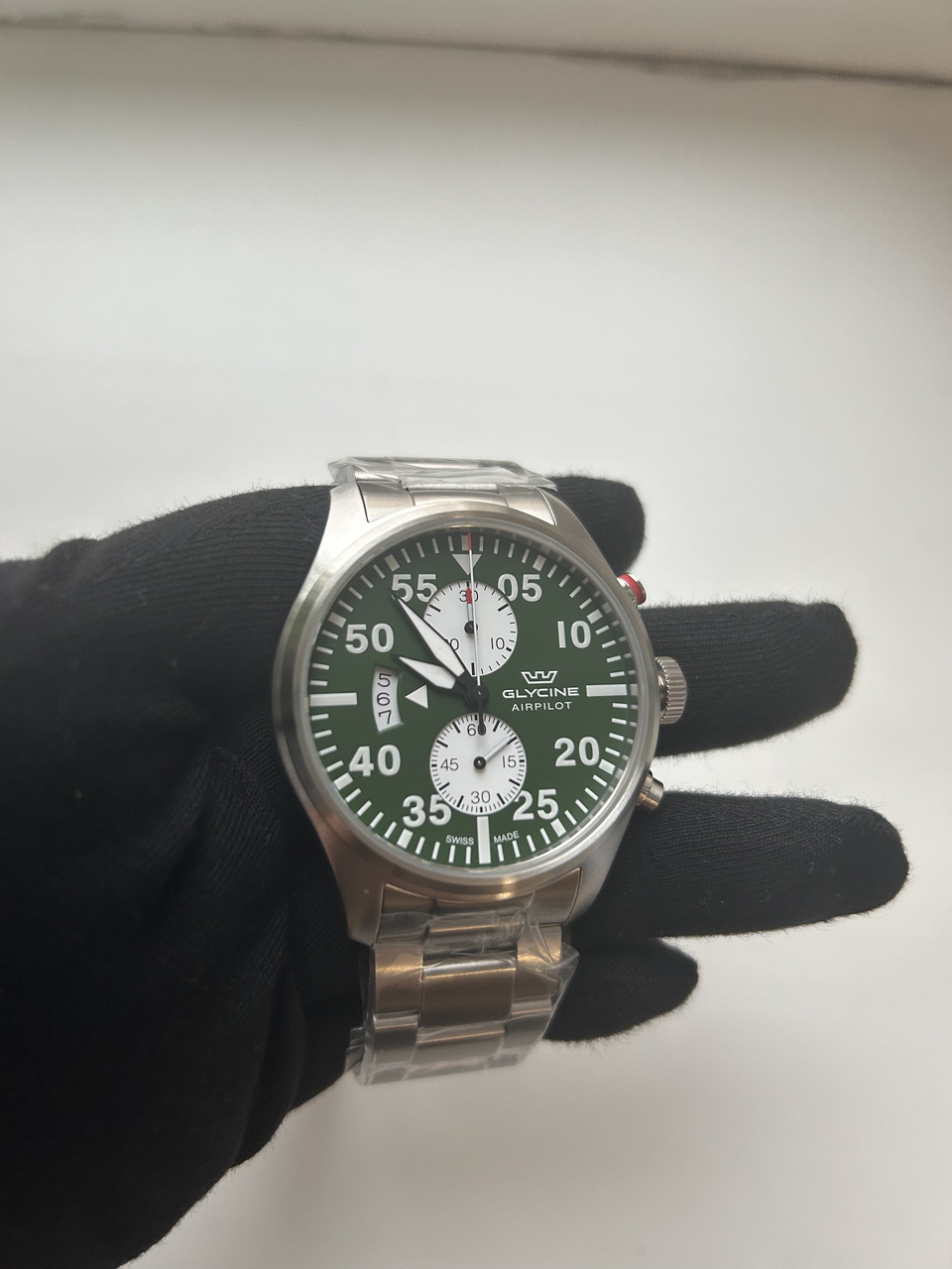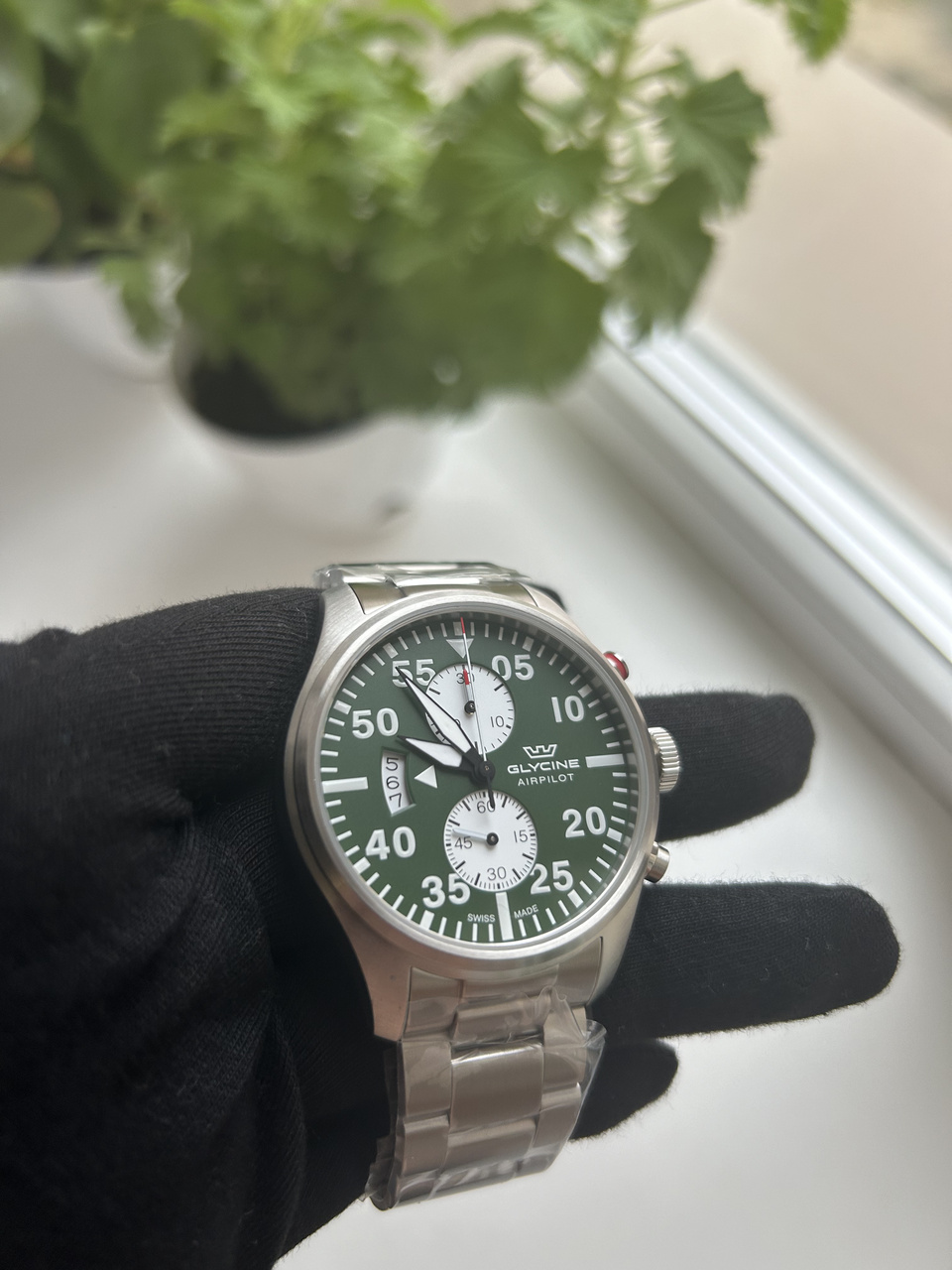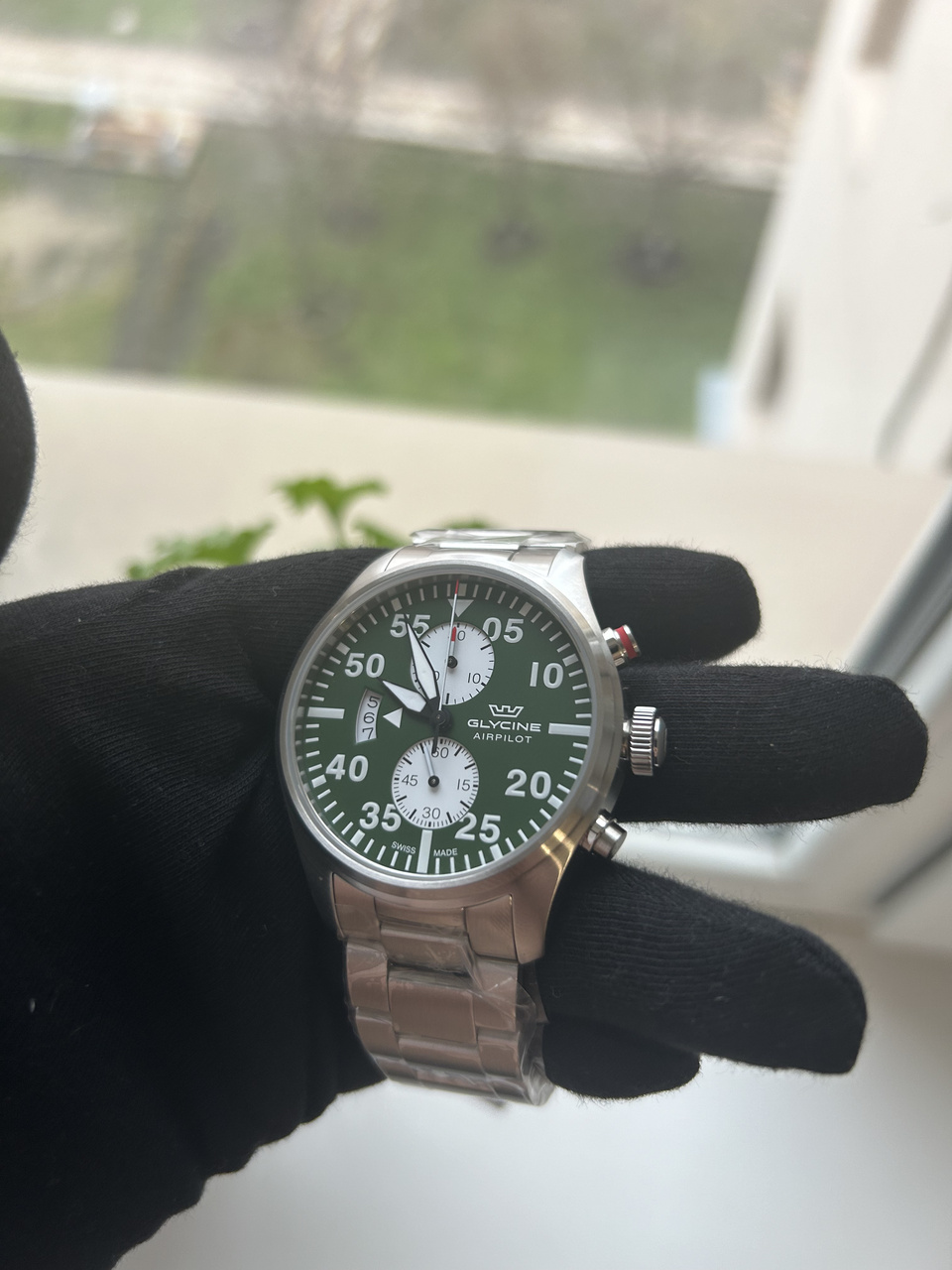 В продаже отличной пилот-хронограф из линейки airpilot от уважаемого производителя. На мой скромный взгляд, это самая удачная и сбалансированная модель в линейке. Очень красивый зеленый цвет цифера, меняющий оттенок в зависимости от освещения, функция хронографа, малая секундная стрелка, интересное оформление указателя даты, шикарный люм, отличный плотный литой браслет с застежкой-бабочкой, отличная проработка цифера, надежный швейцарский кварцевый калибр. Суммарно имеем отличный повседневник фактически без слабых сторон. Часы сделаны очень добротно.