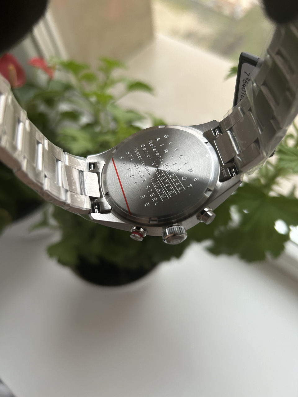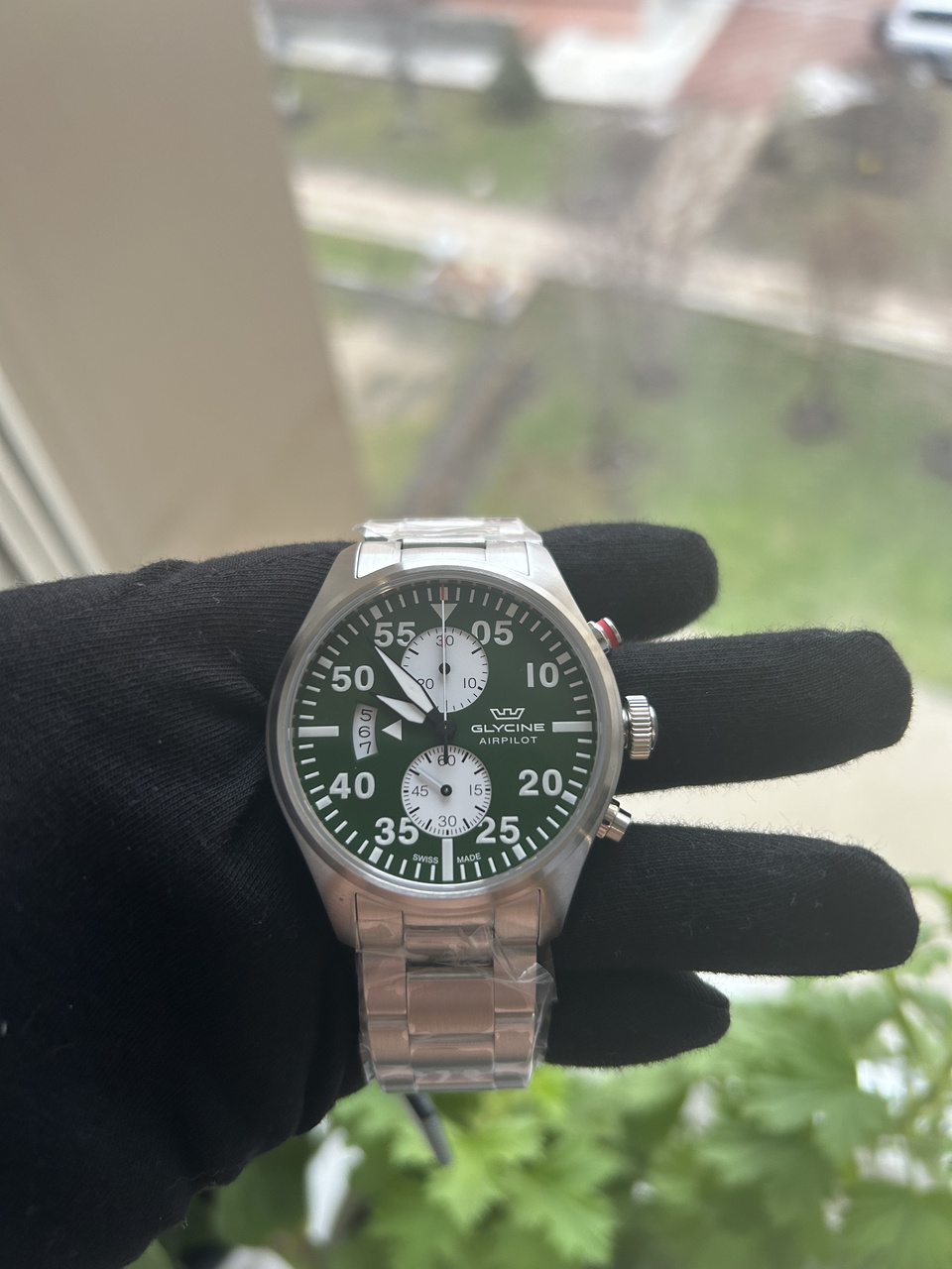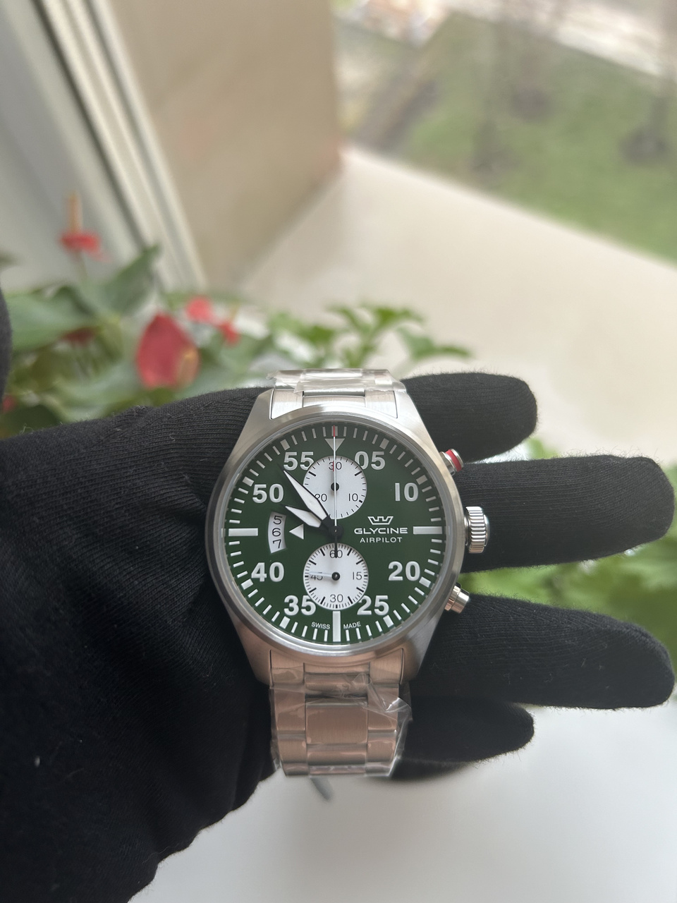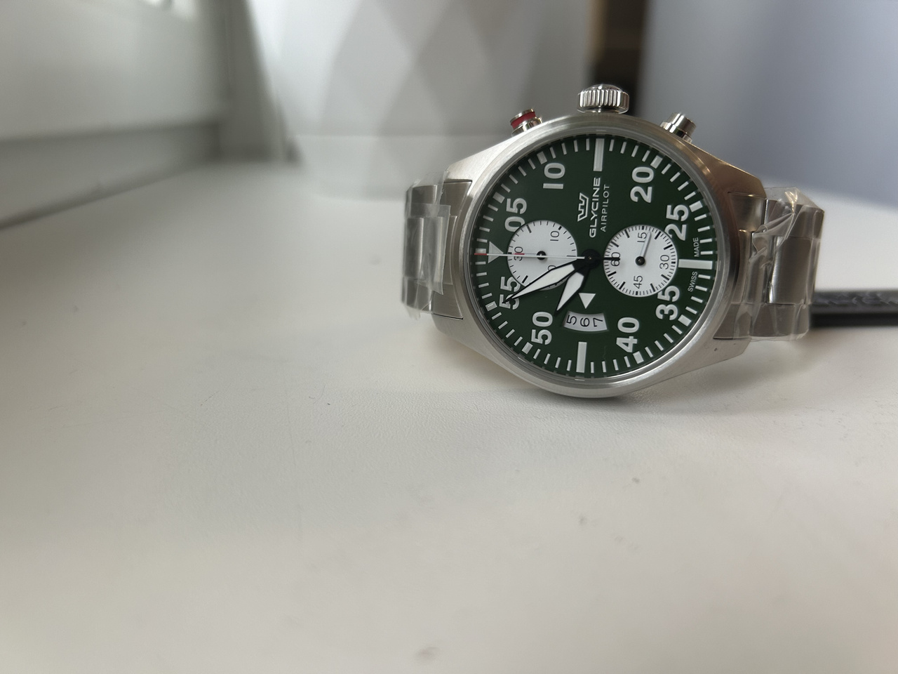 В продаже отличной пилот-хронограф из линейки airpilot от уважаемого производителя. На мой скромный взгляд, это самая удачная и сбалансированная модель в линейке. Очень красивый зеленый цвет цифера, меняющий оттенок в зависимости от освещения, функция хронографа, малая секундная стрелка, интересное оформление указателя даты, шикарный люм, отличный плотный литой браслет с застежкой-бабочкой, отличная проработка цифера, надежный швейцарский кварцевый калибр. Суммарно имеем отличный повседневник фактически без слабых сторон. Часы сделаны очень добротно.