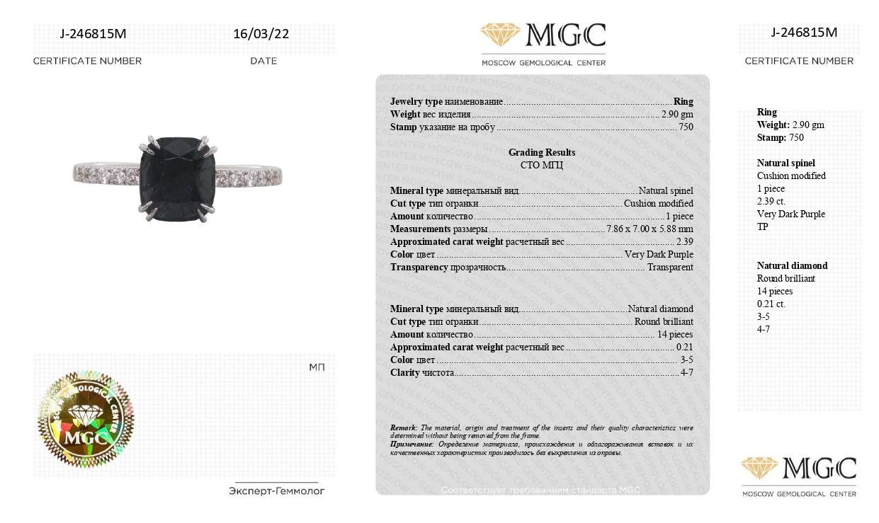Кольцо из белого золота со шпинелью 2,39 карат и бриллиантами 0,21 карат (сертификат МГЦ)