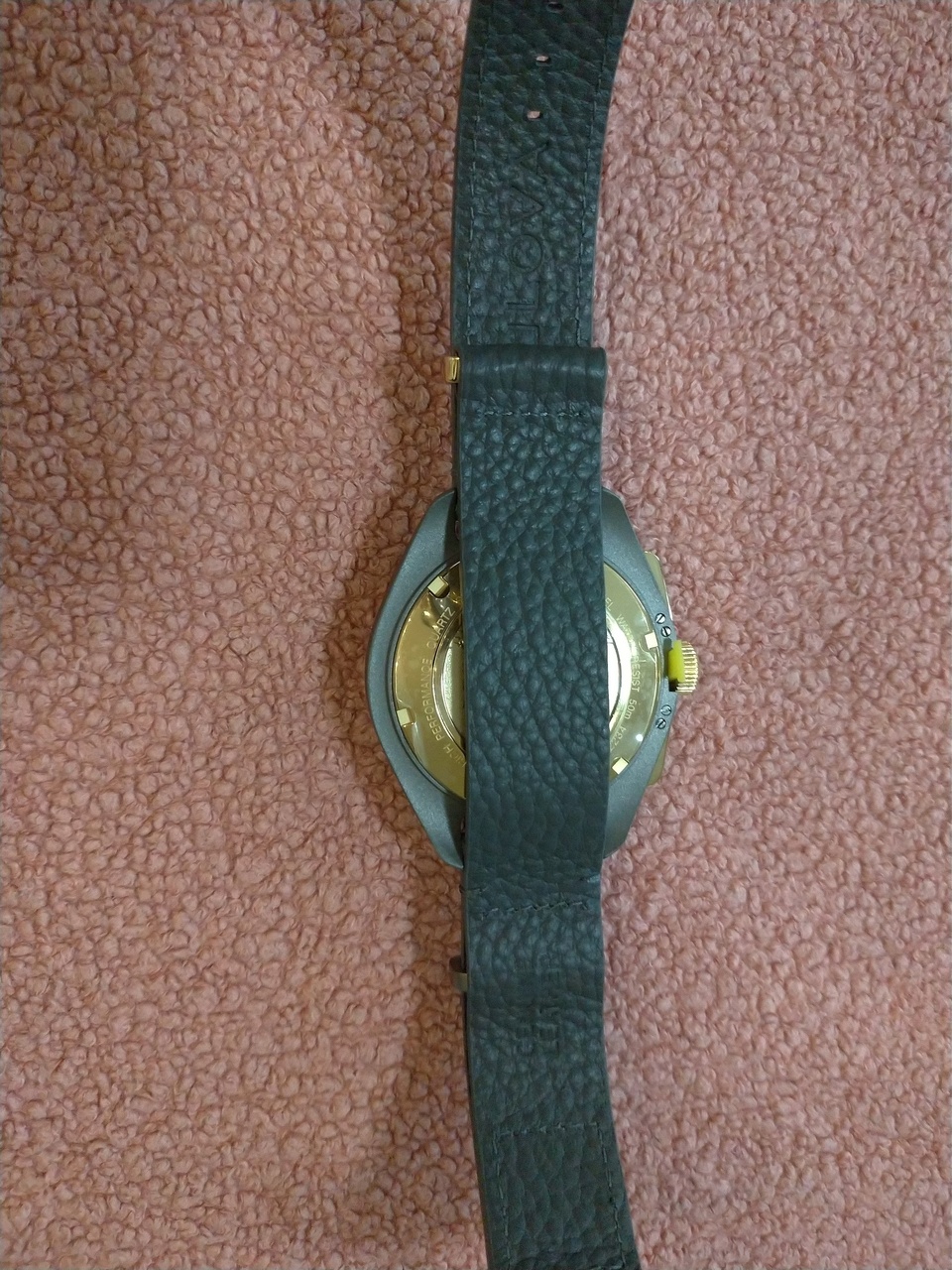 Корпус титановый, grade 5, диаметром 45 мм, толщиной 14 мм, задняя крышка, кнопки, головка, колодцы счётчиков, рант золочёные. Ремешок серый, кожаный, НАТО.