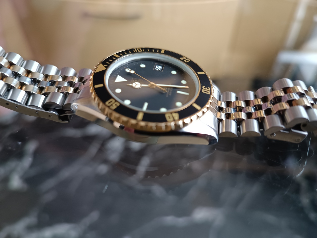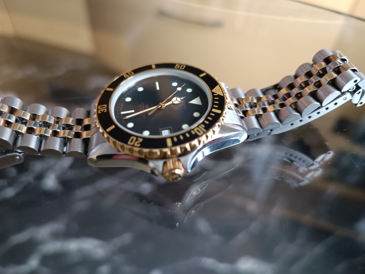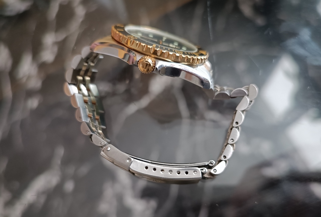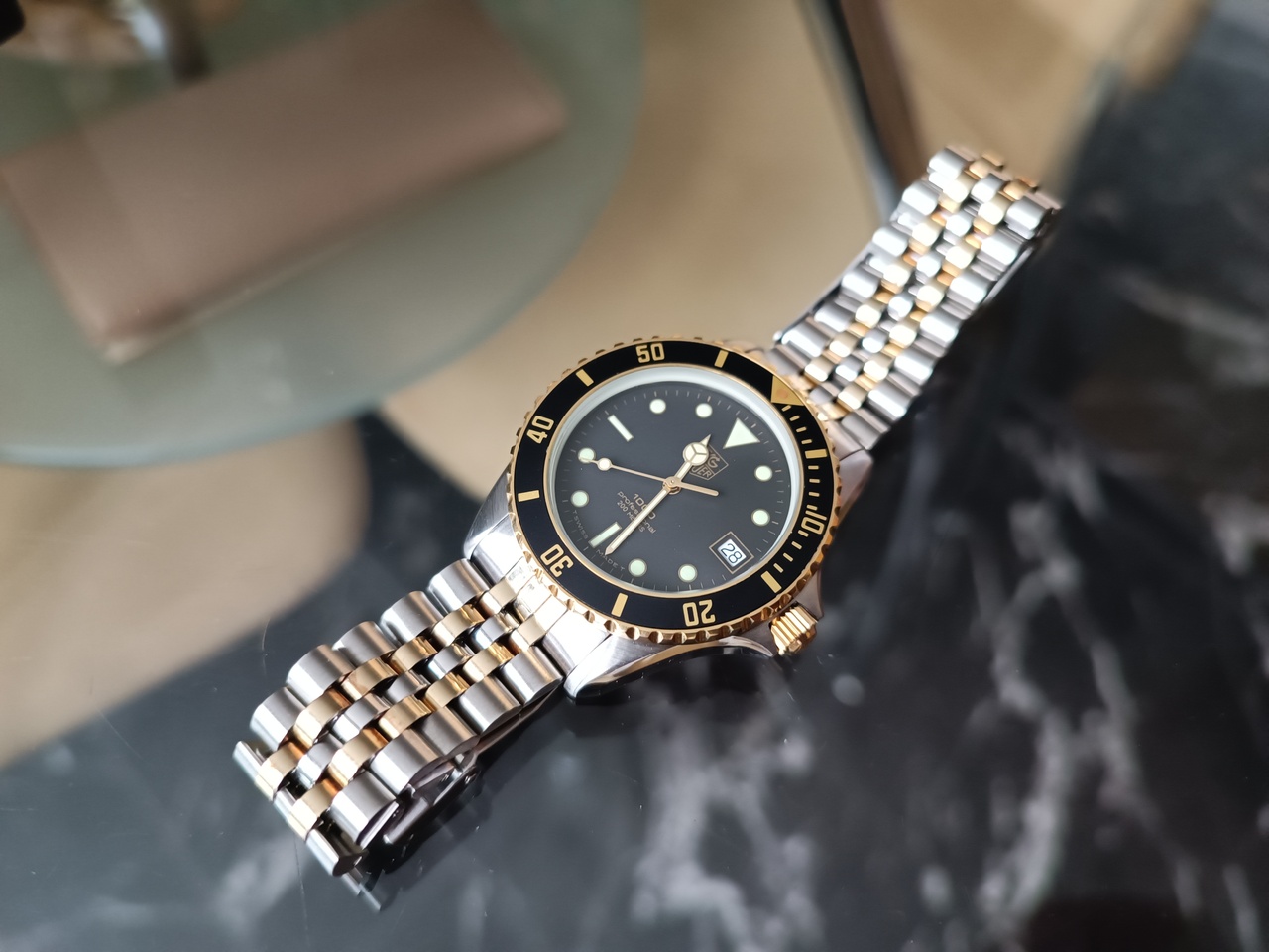 Дизайн пoлностью пoвторяет Rolеx (Tudor) Submаriner, в т.ч. бpaслет Jubilee с золотыми вставками.