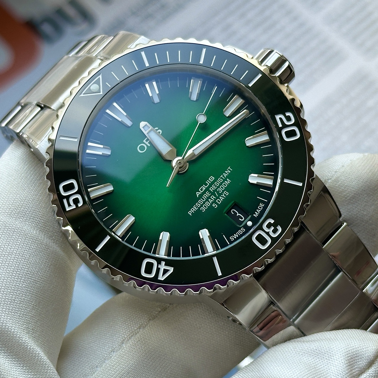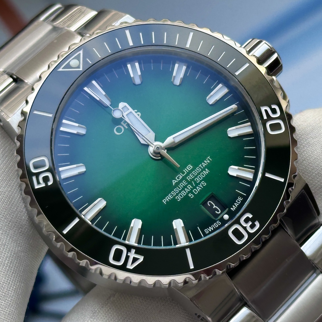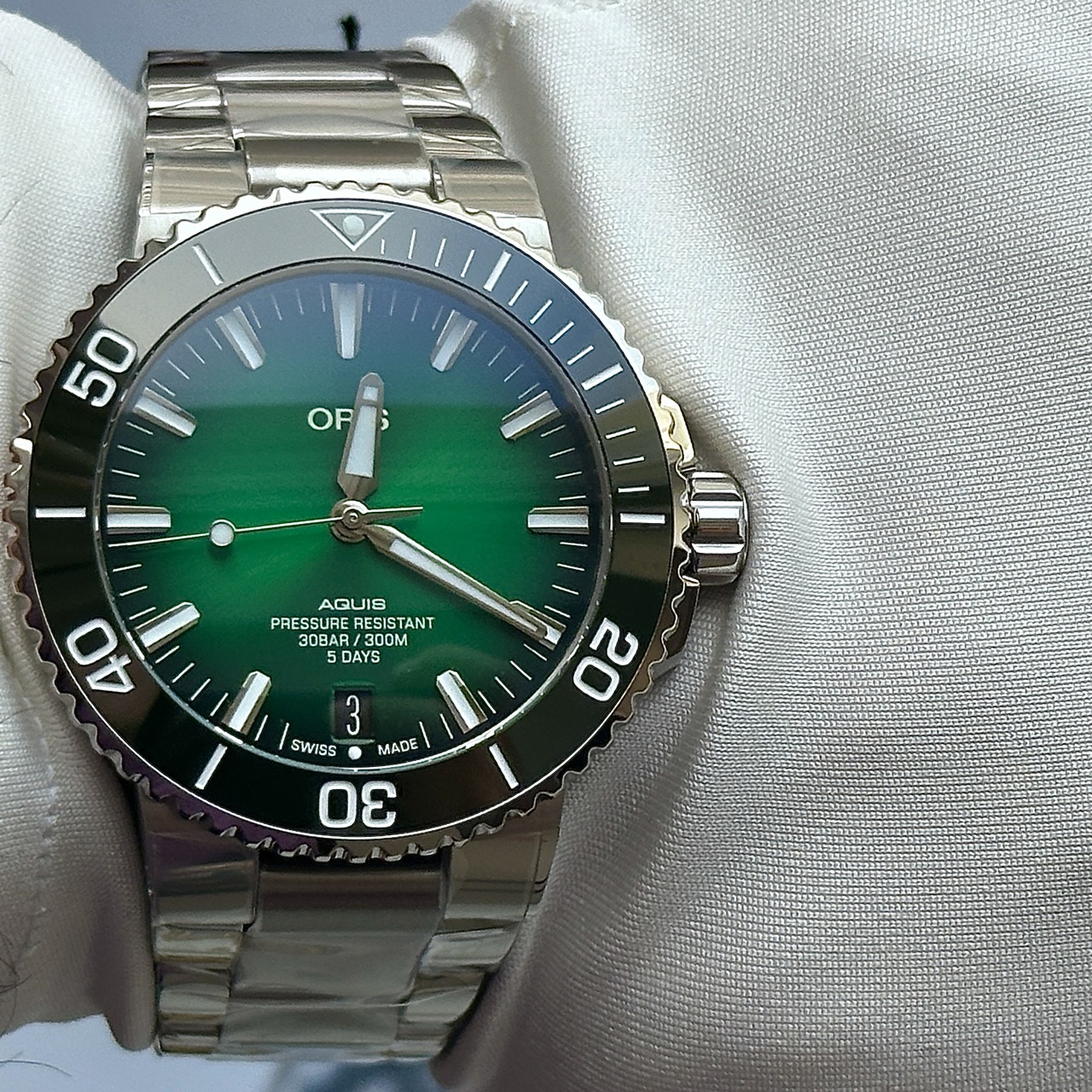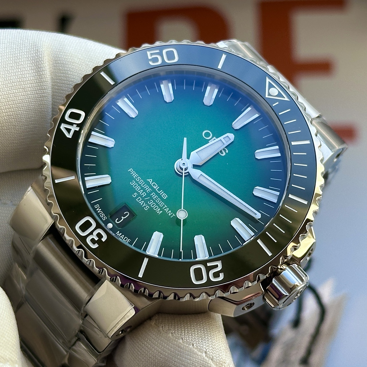 Красавец из флагманской линейки Акуис от мануфактуры из Хёльштайна, с красивым зеленым циферблатом, на калибре Oris 400 - с пятидневным запасом хода. Новинка 2023 года. Крупный размер 43,5 mm, не путайте с более мелкими версиями. 100% eye-stopper. Абсолютно новые, в пленках, полный комплект. Куплены в Штатах.