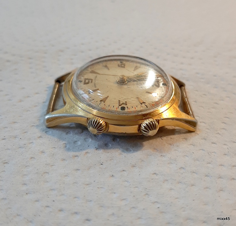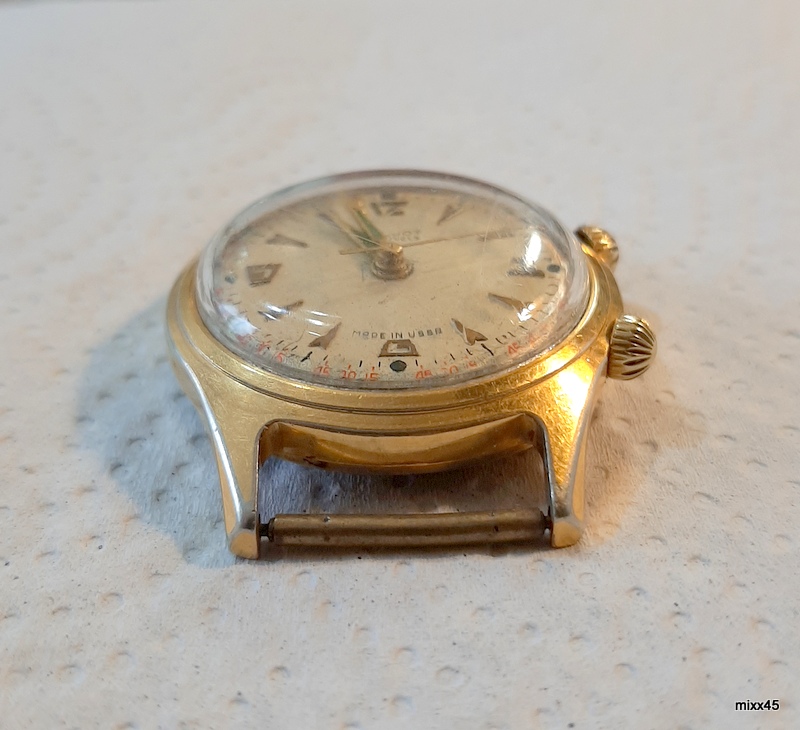Фиксаторы валов на винтах, мех не моложе 62-го. Должна быть двойная крышка. Poljot и кириллица на мосту весьма сомнительно. Похоже мех заменён.