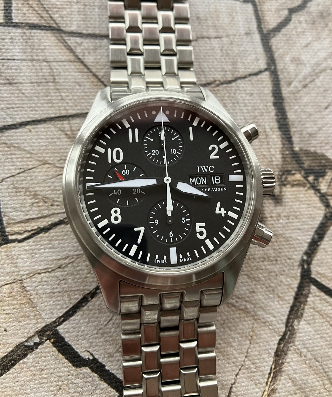В продаже мужские часы IWC Pilot's Watch Chronograph IW371704 в прекрасном состоянии. В комплекте: часы, трэвэл-кейс, карта. Есть гарантия от часовой мастерской Москвы до февраля 2025г.