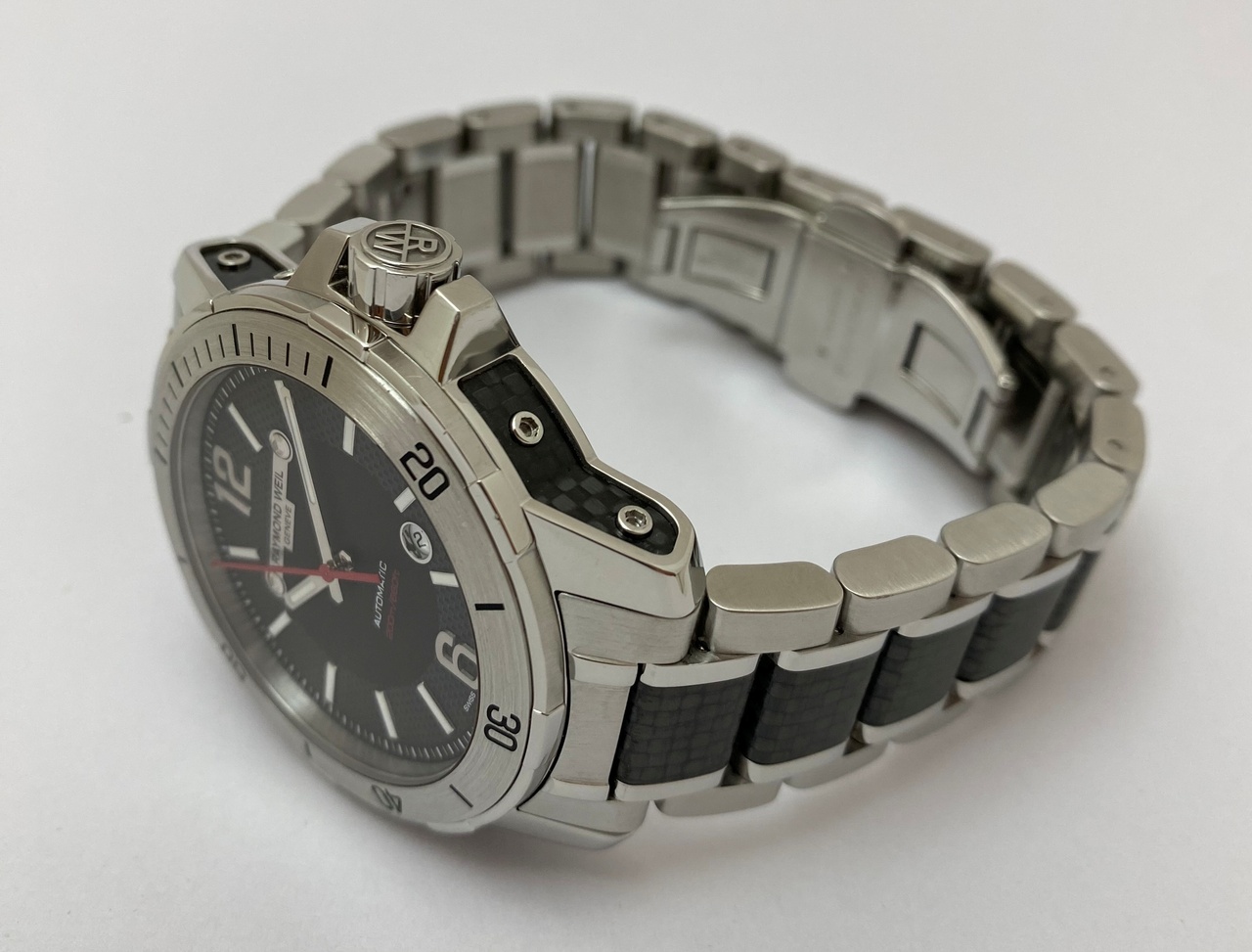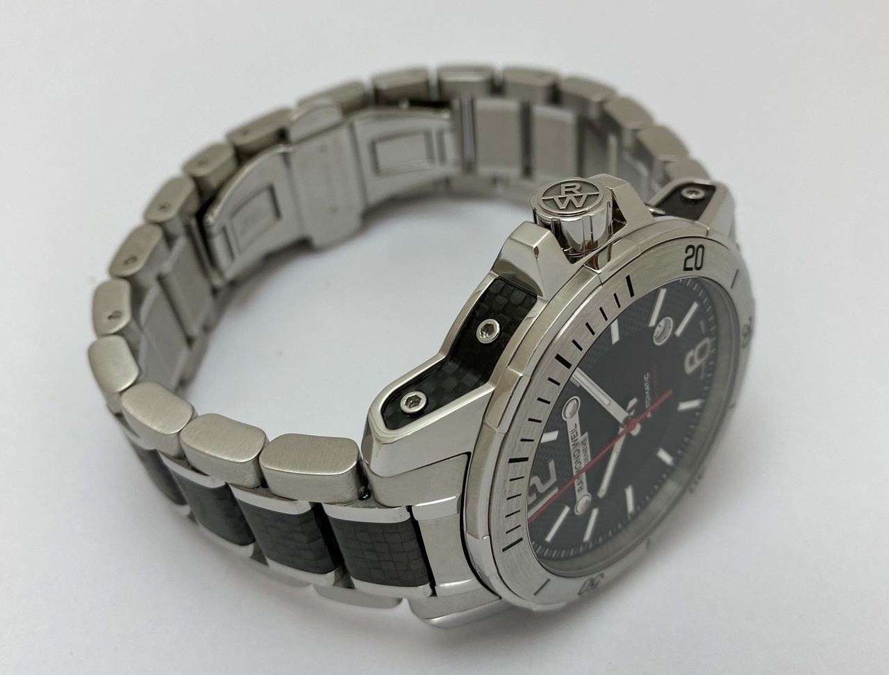 -Стальной браслет со вставками из карбона и раскладной застежкой.