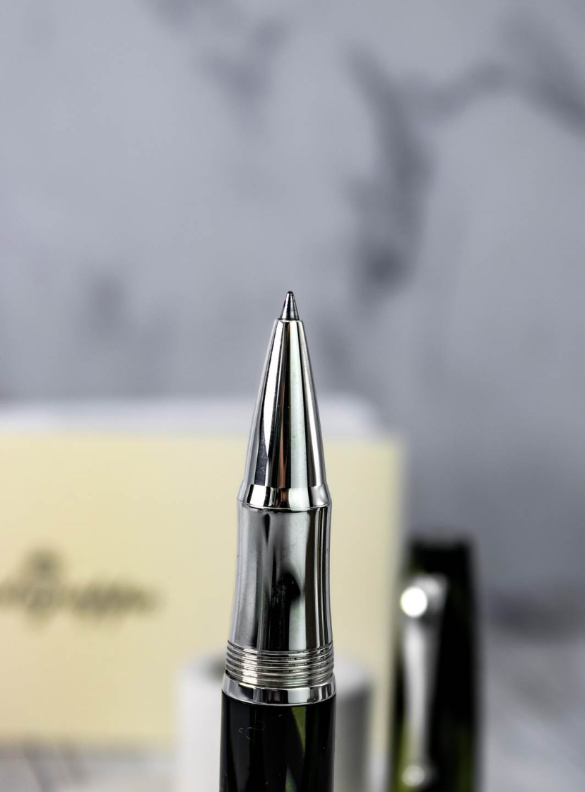 Целлулоидный корпус и колпачок выполнены в черно-зеленом цветовом решении. Такой стиль оформления не останется незамеченным. Также дизайнеры позаботились об удобстве при подписании бумаг – эргономичный корпус легко держать в руке. Материалом для отделки выбрали металл – стерлинговое серебро пробы 925. Колпачок дополнен глубоким узором на вставке.