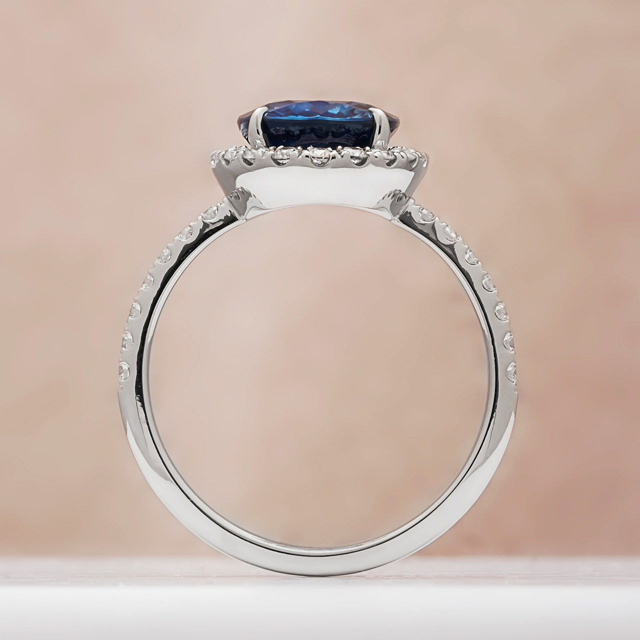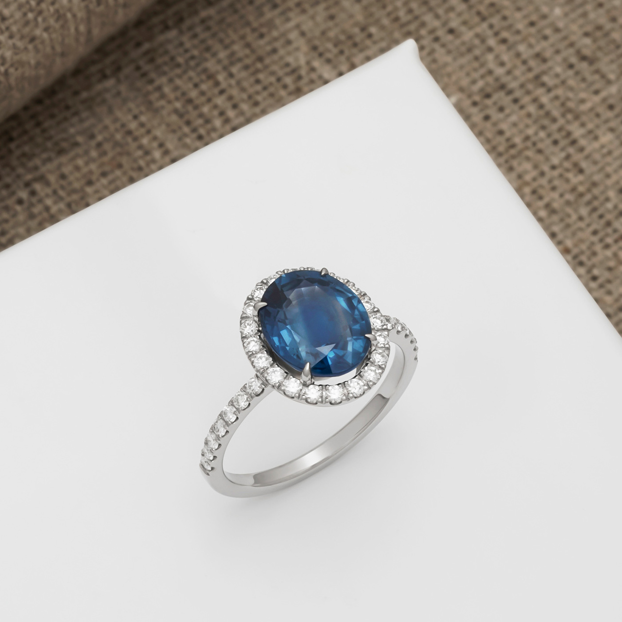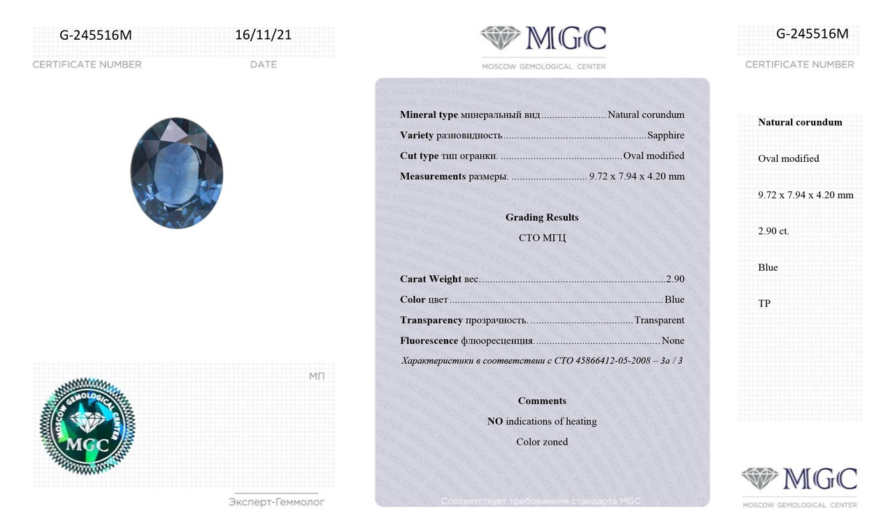 Кольцо из белого золота с необлагороженным сапфиром 2,9 карат и бриллиантами 0,37 карат (сертификат МГЦ)