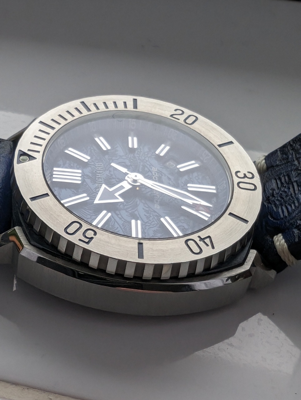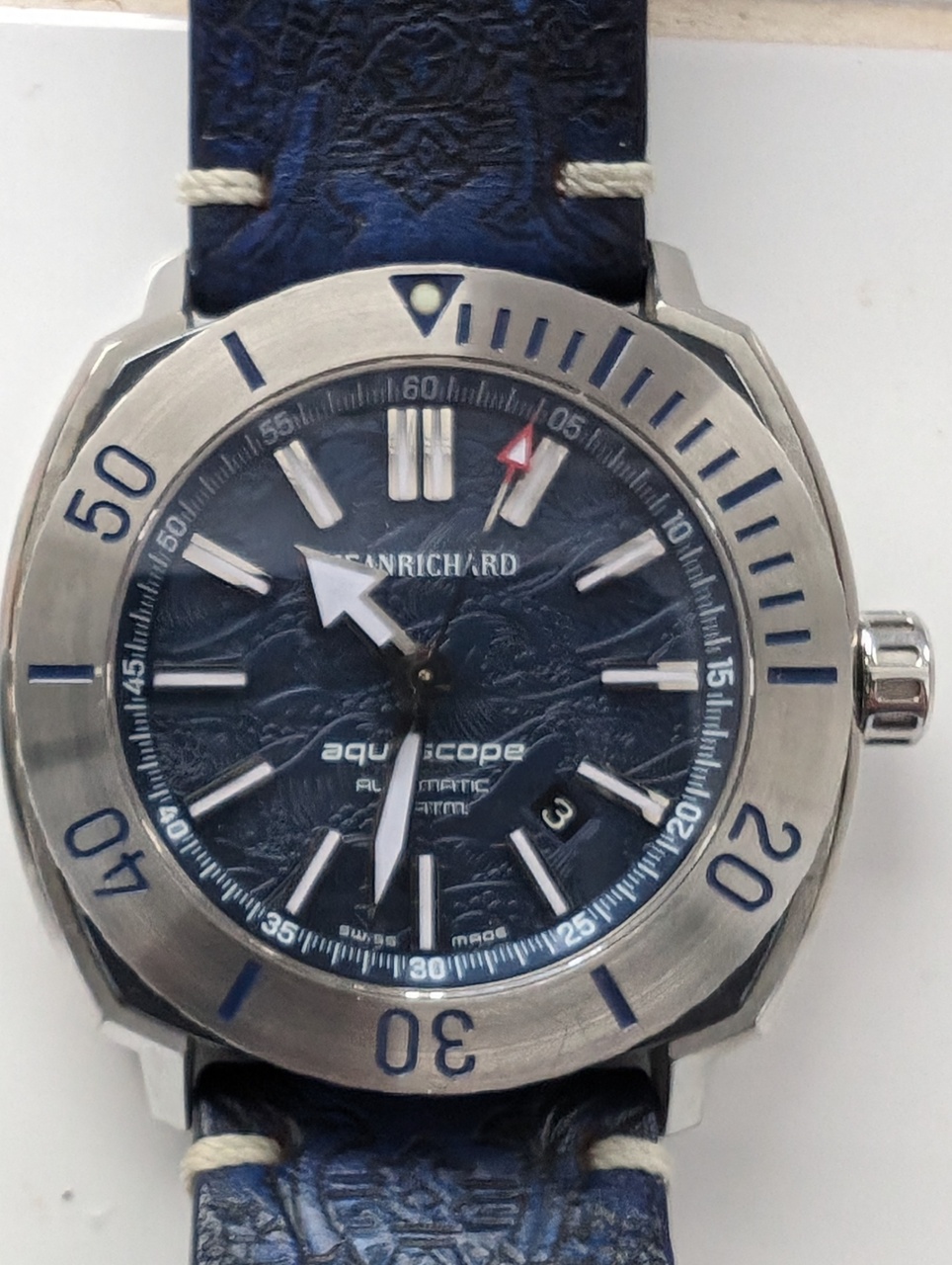 Циферлат - с гравированным рисунком в виде волны с картины японского художника Хокусая "Великая волна у Каганавы" Цвет цифера меняется в зависимости он падающего света, на цифере накладные парящие часовые метки с люминесцентными элементами. Считываемость времени просто отличное, все очень контрастно, на цифере ничего лишнего.
