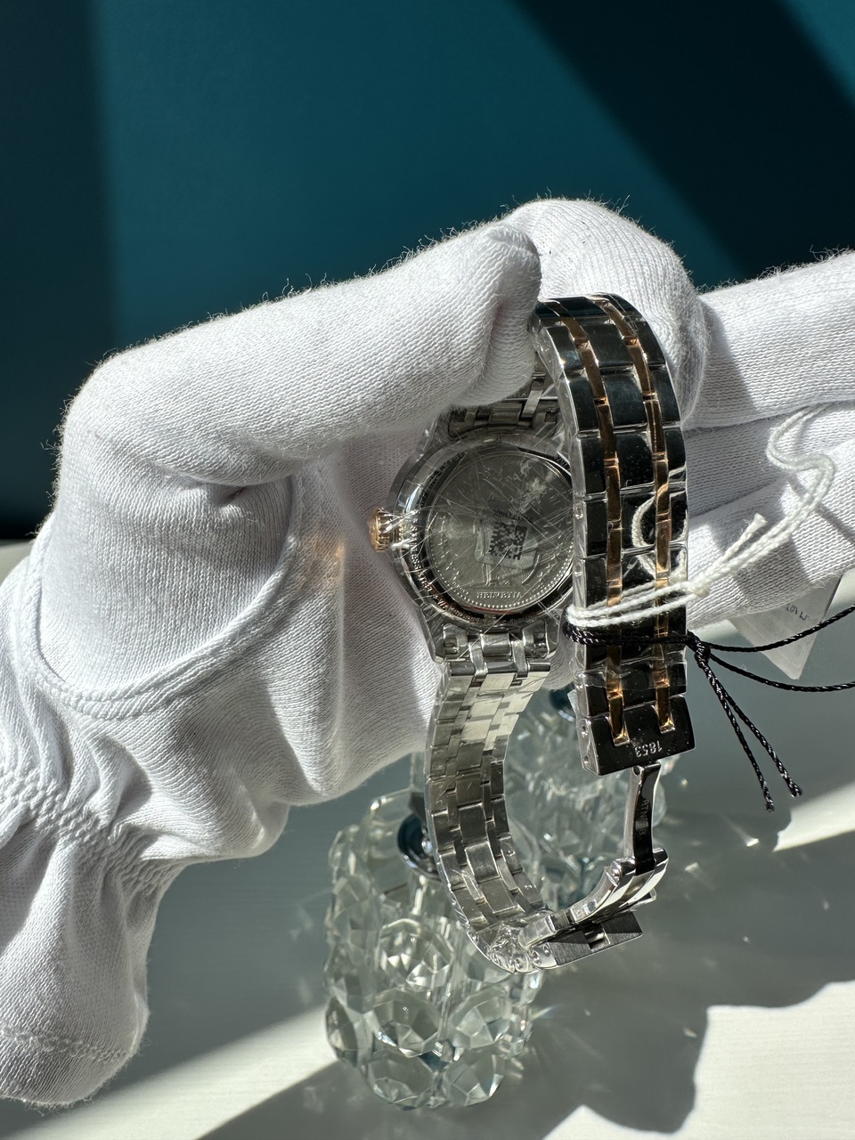 Двухцветная модель имеет светлый циферблат с оригинальным узором и перламутровой вставкой, дополнительную прелесть придают винтажные римские цифры. Задняя крышка напоминает швейцарский франк, на котором изображена гордая Гельвеция –персонифицированный образ Швейцарии. В основе работы часов лежит автоматический калибр ETA Powermatic 80 с 80-часовым запасом хода. Выпуклое стекло из сапфира с антибликовым покрытием. PVD-покрытие оттенка розового золота. Водостойкость 50 метров. Апертура даты. Габариты: 32 x 32 x 11 мм.