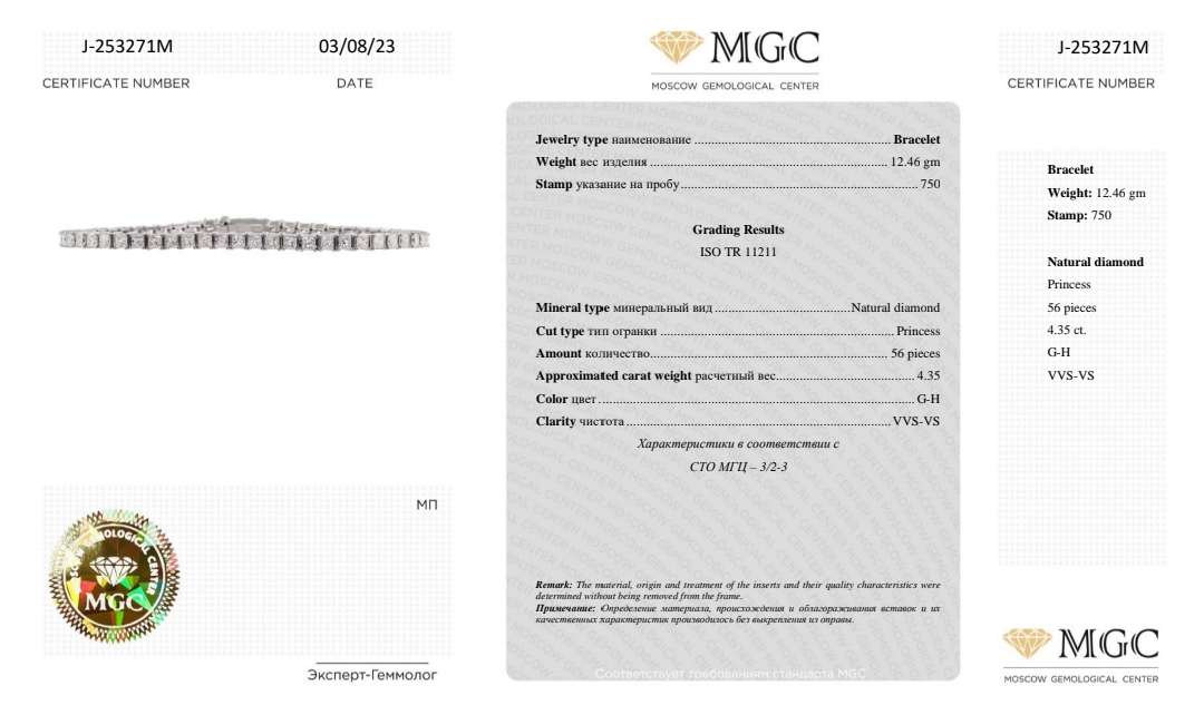 Браслет из белого золота с бриллиантами 4,35 карат (сертификат МГЦ)