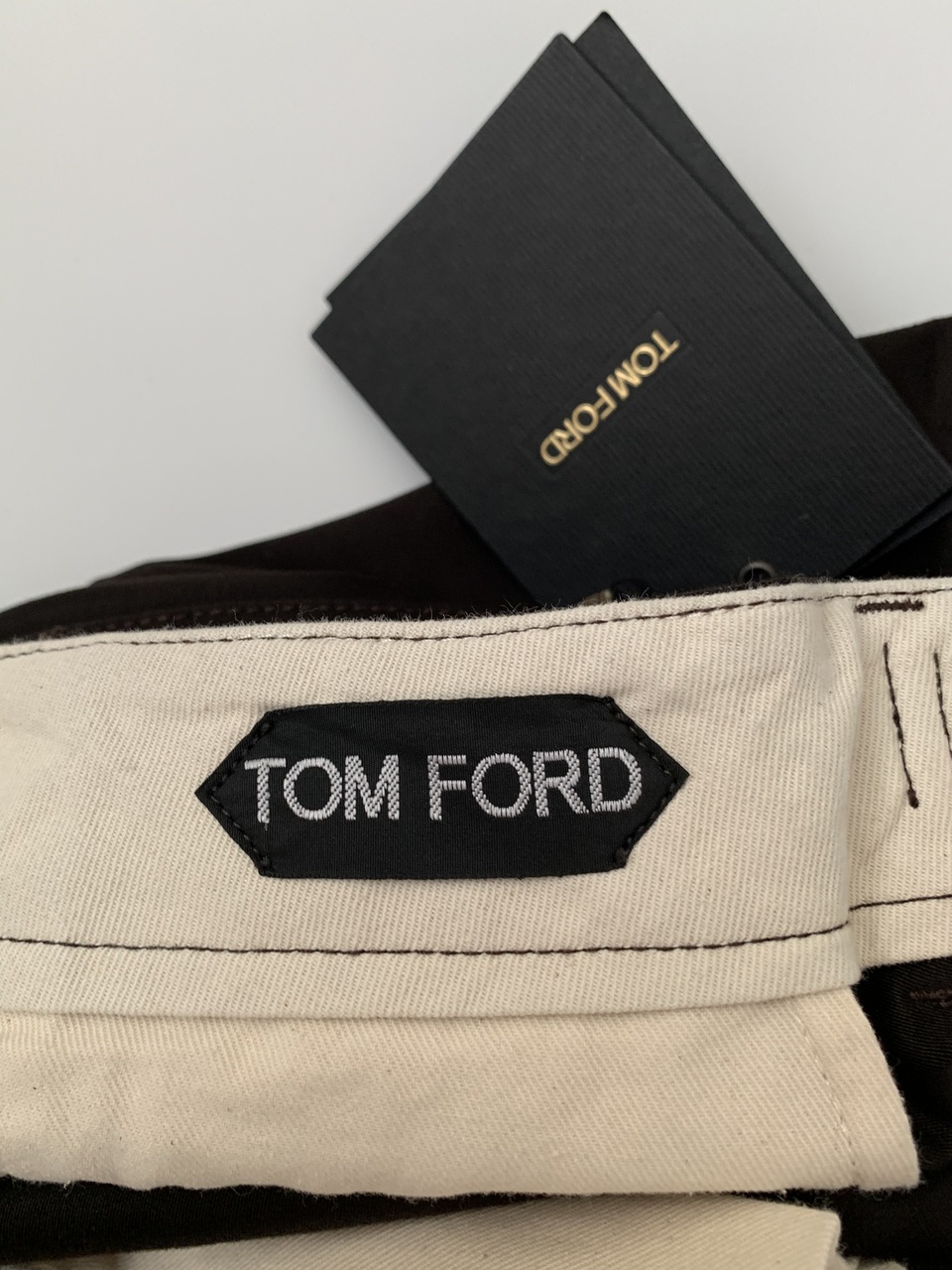 К созданию тёмно-коричневых карго Tom Ford подошёл с максимальным вниманием к комфорту.Модель выполнили так,чтобы она повторяла силуэт тела:за это отвечают защипы в области коленей.Заниженная линия шага не сковывает движения,а мягкий плотный хлопок не перегревает тело.
