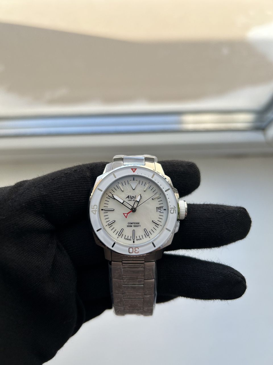 В продаже отличный женский дайвер от уважаемого производителя. Перламутровый цифер с накладными элементами, красиво переливающийся на солнце, швейцарский кварцевый калибр, отличный литой браслет. Суммарно имеем универсальный повседневник фактически без слабых сторон. В живую часы выглядят гораздо богаче и интереснее чем на фото. Ритейл $1295
