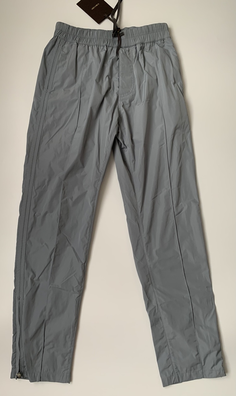 Брюки изготовлены из быстросохнущей нейлоновой ткани,что позволяет не сковывать движения при ходьбе и занятиях спортом.Пояс с резинкой регулируется с помощью шнурка,внизу брючин металические молнии с крупным брендированным бегунком.Боковые,прорезные карманы спереди,накладные карманы сзади имеют застёжку на пуговицы-клёпки с логотипом дизайнера.