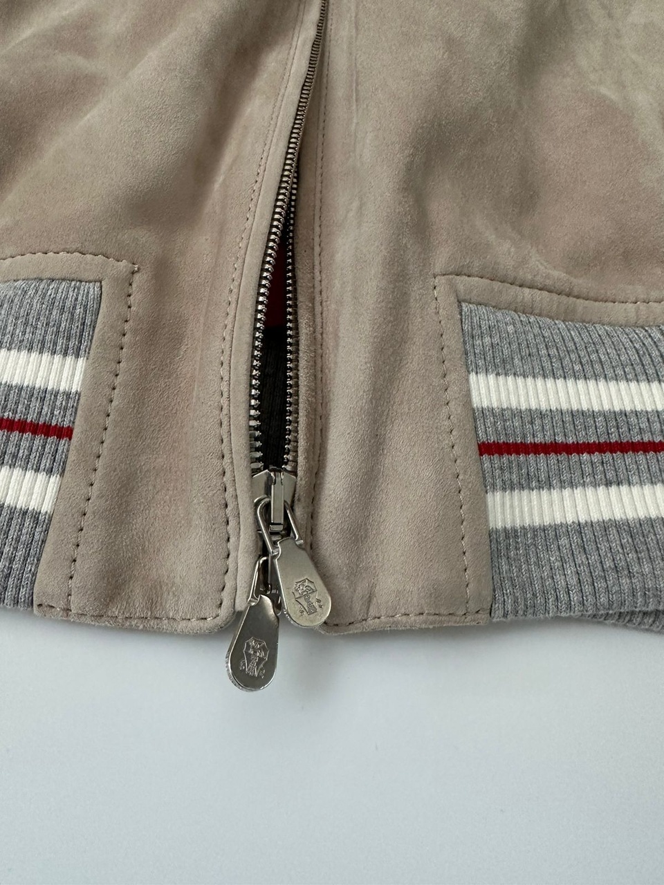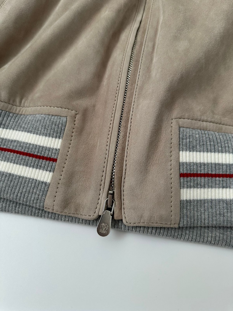 Ценность материалов Brunello Cucinelli облагораживает культовый спортивный стиль куртки-бомбера из замши светло-серого оттенка.Замша, легендарный вид кожи из коллекций Brunello Cucinelli, отличается очень мягкой и легкой текстурой,обуславливающей комфорт при носке.