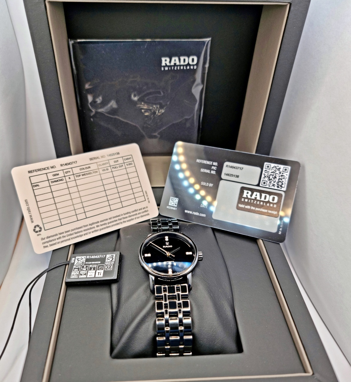 В продаже шикарные женские механические часы с бриллиантами Rado Diamaster внутри которых трудится автоматический швейцарский механизм с высокой точностью ETA 2681 на 25 камнях. Сапфировое стекло устойчивое к появлению царапин, обладающее высокой прозрачностью. Класс водозащиты: 50 метров, позволит защитить корпус от случайных брызг или капель дождя. Корпус часов и браслет изготовлен из высокотехнологичной керамики чёрного цвета. Насыщенный чёрный циферблат с бриллиантовыми метками.