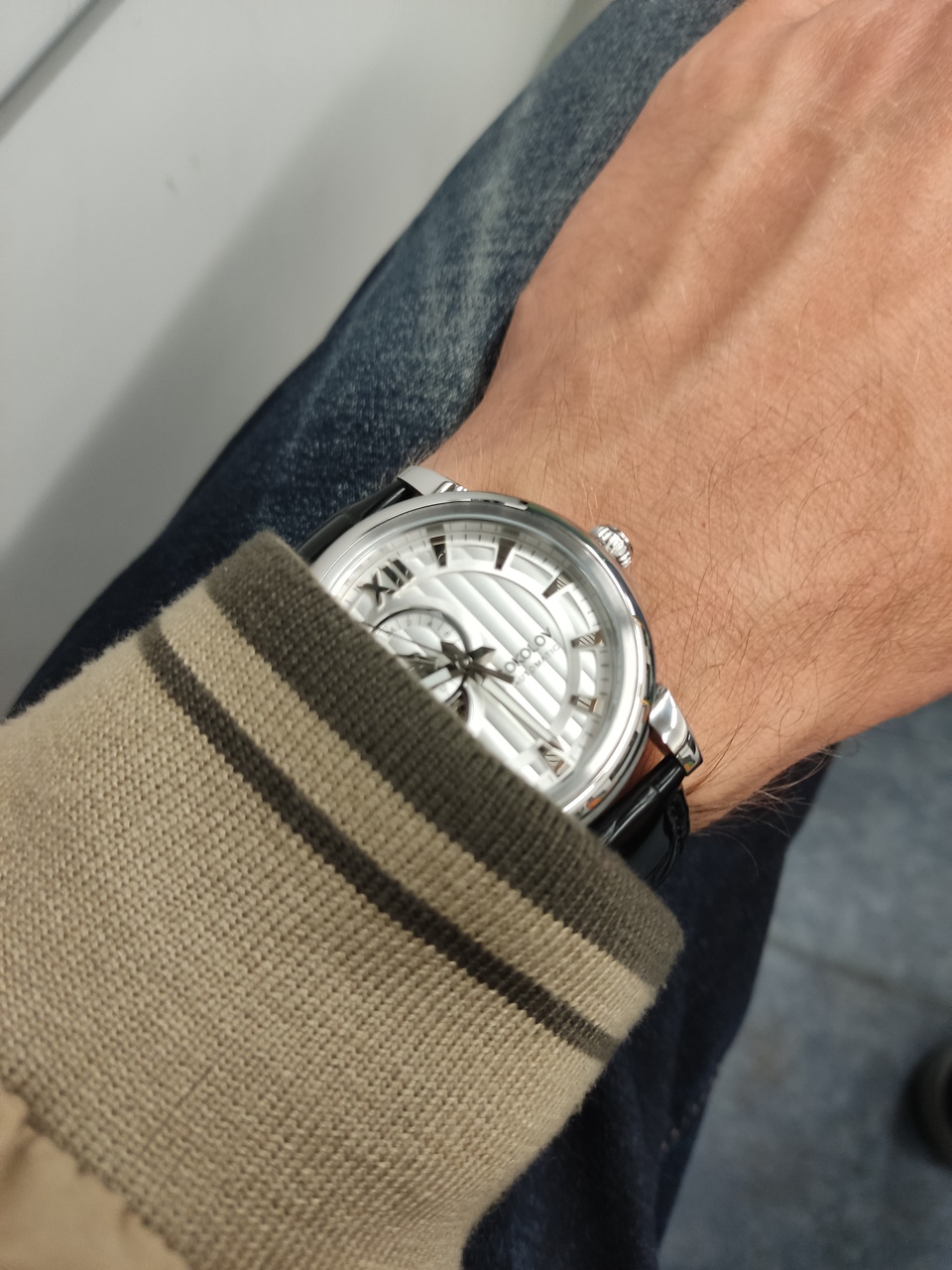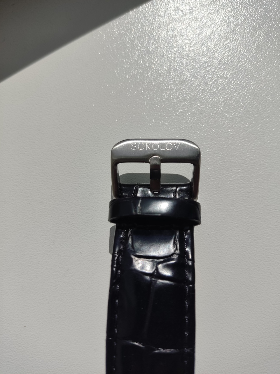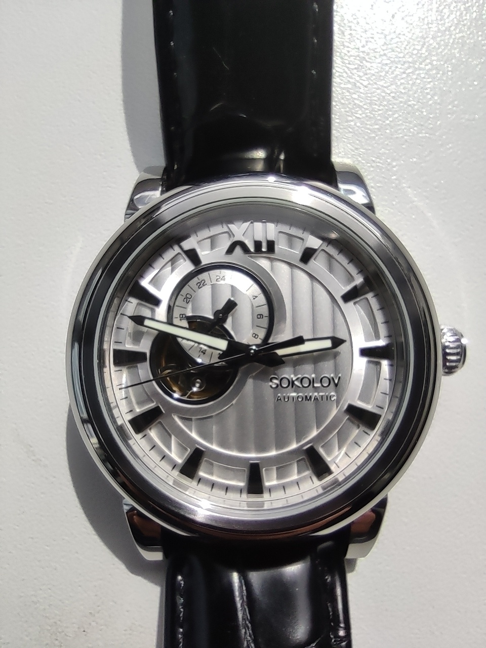Судя по всему, - это единственная тема на форуме, посвященная часам SOKOLOV. Ну так получилось, что с "бухты барахты" приобрел часы этого бренда. Так бывает, что ищешь что-то конкретное, а в моем случае это были механические дайверы, а потом, поддавшись эмоциям, покупаешь нечто совершенно далекое от первоначальной задумки. Эмоции в наше время - это прежде всего нереально завышенные цены на всю "Швейцарию", да и на " Японию" тоже. Стал смотреть микробренды, в частности заинтересовал Spinnaker. Неплохи, конечно Orient. Seiko дайверы как-то не впечатляют(чисто субъективное восприятие их дизайна). И в этом поиске, через часы с базовым механизмом Seiko внутри, случайно набрел на часы SOKOLOV . Увидев ценник всего в 15 т. (с учетом скидок) решил посмотреть на них живьём, купил, делюсь впечатлениями спустя месяц носки. Коллекция FEEL THE POWER. Главное, что можно сказать об этих часах - они красивые, я бы сказал нарядные, заметные на руке и оригинальны по дизайну. Расцветки в этой коллекции серебристые(как у меня), черные и синие. В смысле читаемости - черные и синие, конечно, в приоритете. Но взял серебристые - захотелось весной чего-то яркого. Сразу оговорюсь - в некоторых сценариях освещения приходится присматриваться, чтобы считать время, особенно сливается секундная стрелка(правда зрение у меня не 100%). И, пожалуй, это единственный существенный недостаток часов именно серебристой расцветки. Часы в диаметре 44, высота 11 мм. С моим узким запястьем (17, 5) я и не смотрел на часы больше 42мм.в диаметре, однако эти сели неплохо. Дело в том, что ушки на корпусе закреплены на винтах и подвижны, люфт приличный, пару мм. точно. Общий вид часов весьма брутальный. Никаких попыток визуально уменьшить высоту стального корпуса дизайнеры не предпринимали - плоский безель, плоская задняя крышка. Безель и ободок задней крышки полированные, боковые грани корпуса скруглены и сатинированы. На ушках верхние грани полированные, боковые сатинированы и имеют острый угол. Стекло минеральное. Задняя крышка прозрачная на винтах. Изюминкой циферблата является имитация "женевских волн" , которые переливаются на свету (что-то похожее я видел у Mido). Открытый баланс уравновешен еще одним кольцом с 24 часовой шкалой(не GMT). Индексы крупные, полированные и объединены внутренним кольцом, визуально уменьшающим размер циферблата. Недостаток индексов лишь в том, что они плоские и не имеют боковых отражающих граней(как у более дорогих серебряных часов этого же производителя), это конечно "удешевляет" вид, но на читаемости не отражается. Стрелки крупные, "карандаши" со скошенными гранями и сочным люмом (люм только на стрелках, на индексах нет). На заводной головке гравировка S. Как нанесено брендирование на циферблат не подскажу, но надпись выглядит изящно и гармонично. Как я уже писал, внутри механизм NH 39 A (TMI). Стоп - секунда имеется. При активной носке часы показывают суточный ход -2, -3 сек. Если оставить лежать, то погрешность возрастает и уходит либо в +, либо в -. Поэтому можно приноровиться и добиться минимальной погрешности за счет определенного положения часов в ночное время. Ремешок ничего особенного из себя не представляет, написано кожа. Пока еще не размягчился. Произведены часы, похоже, в Гонконге . В итоге - часы годятся под любую одежду, конечно это не спортивный вариант, больше для повседневной одежды, сойдут и под кос