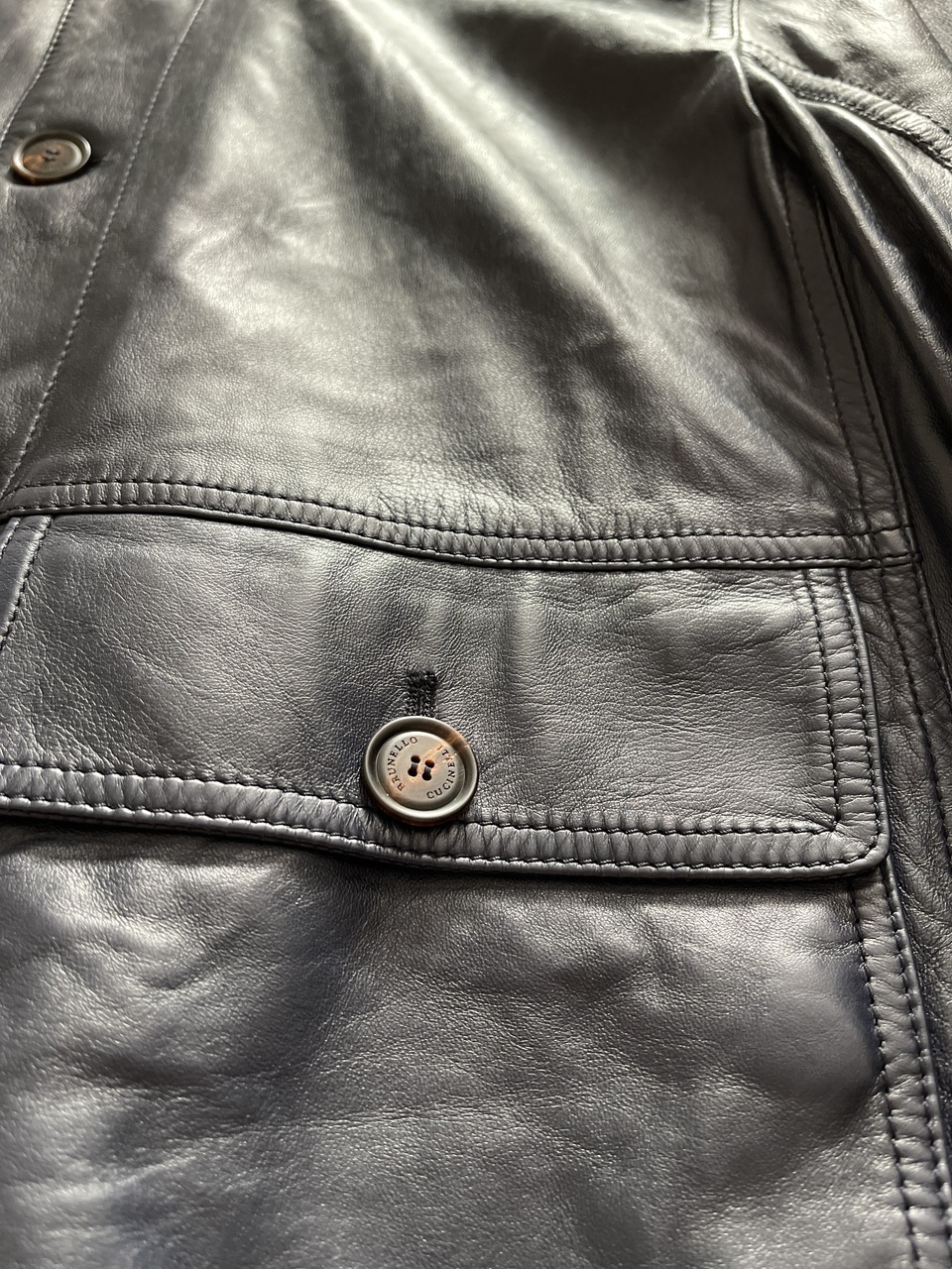Ценность материалов Brunello Cucinelli украшает культовый стиль модели из мягкой гладкой кожи синего цвета, которая характеризуется слегка грубоватым видом.Типичные широкие передние карманы,застёжка на роговые пуговицы и детали из трикотажа в рубчик на воротнике,манжетах и нижнем крае завершают стиль модели,напоминая о классических видах пряжи коллекций BC.