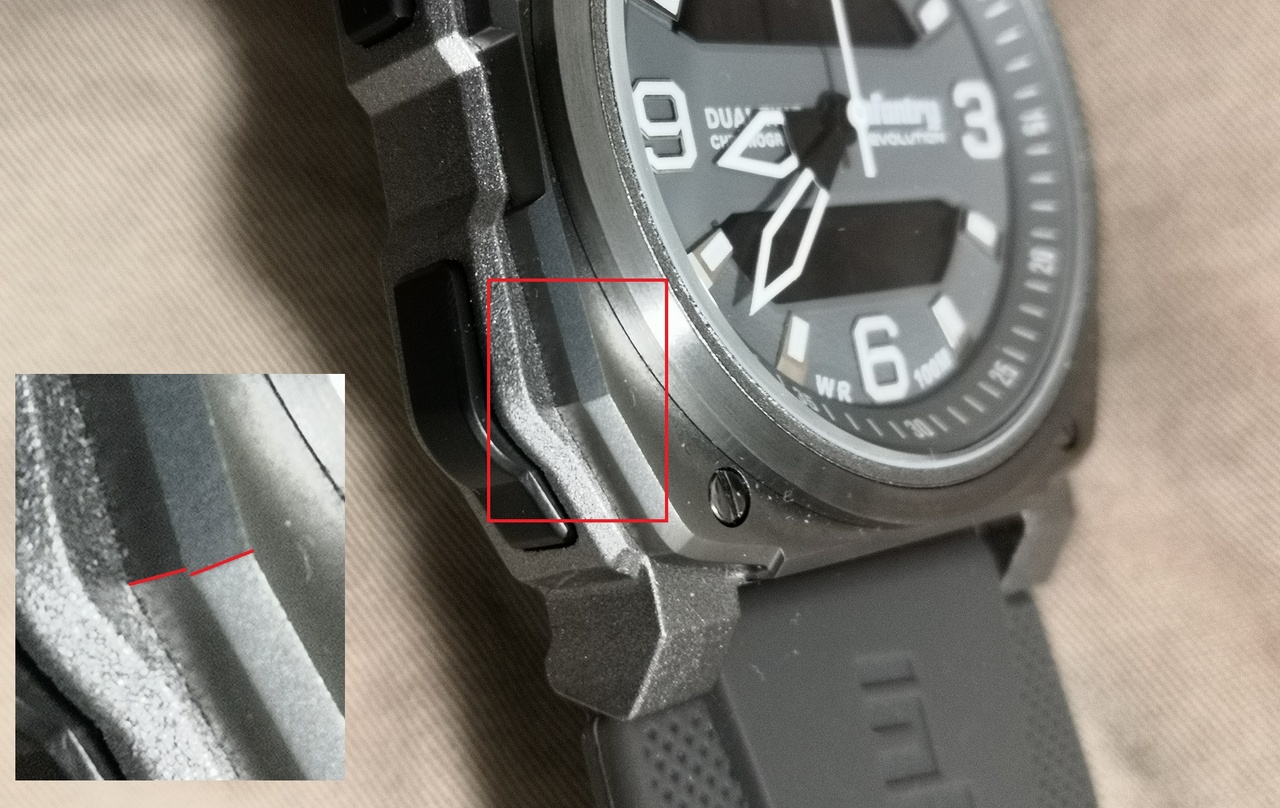 Вблизи, однако, видно, что на циферблате экономили. Логотип и надписи нанесены нечетко. Ладно бы только на шероховатой поверхности, так они и на гладких слегка расплываются. Люм не по центру меток, а его границы расплывчатые (к цифрам вопросов нет). Ну а кольцо с секундной разметкой не совпадает с часовыми метками.