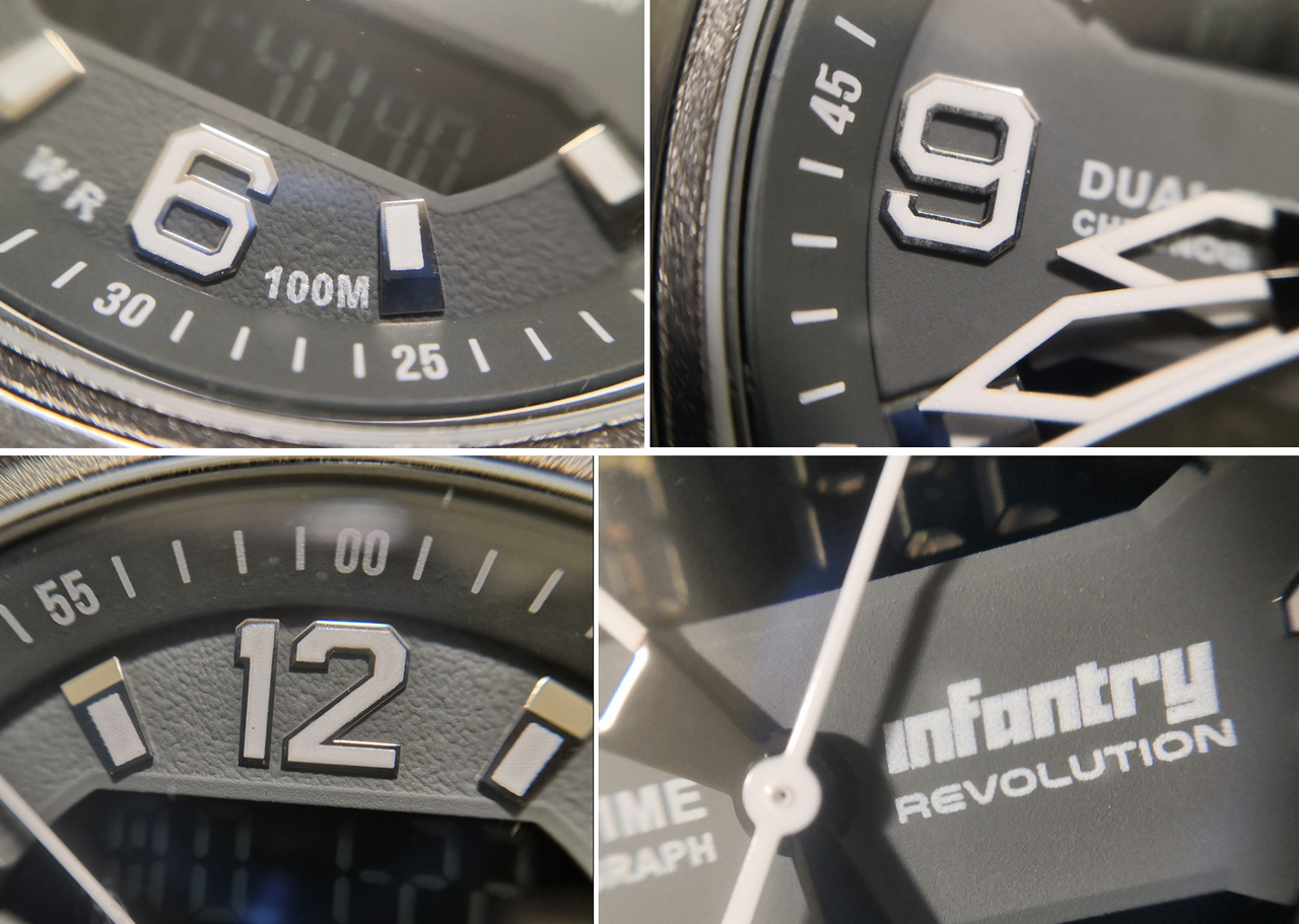 С расстояния вытянутой руки с циферблатом все отлично. Металлические накладные цифры и метки — объемные, на каждой контрастный белый люм. Основная часть циферблата чуть шероховатая, а “мост” от 9 к 3 — гладкий. Стрелки простенькие и пластиковые, но это соответствует цене и стилю милитари. Внутренняя часть стрелок сплошная, а оконечности скелетонизированные, чтобы не закрывать дисплеи — разумно.