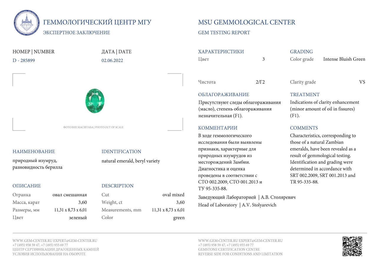 Изумруд весом 3,6 карат, цвет 3, чистота 2, метод облагораживания – промасливание