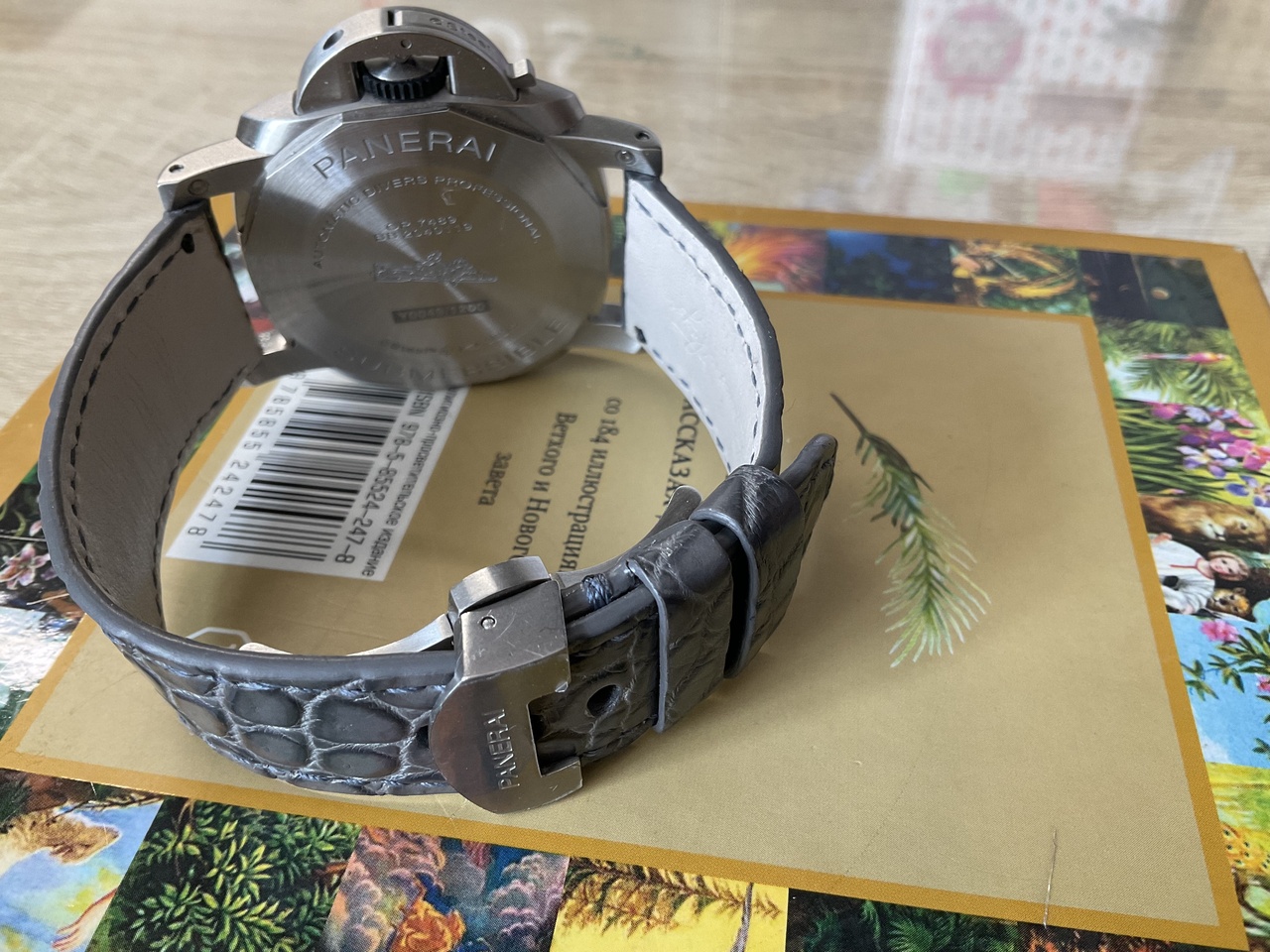 Panerai PAM1288. Куплены в октябре 2022 года в бутике «Panerai» в Стамбуле. На фото на сером, в цвет циферблата, ремешке из крокодила и оригинальной клипсе, купленной отдельно. Так-же в комплекте родной каучуковый ремешок с оригинальной простой застежкой. Серый циферблат от светлого к темному. Полированный керамический безель. Очень красивые часы.