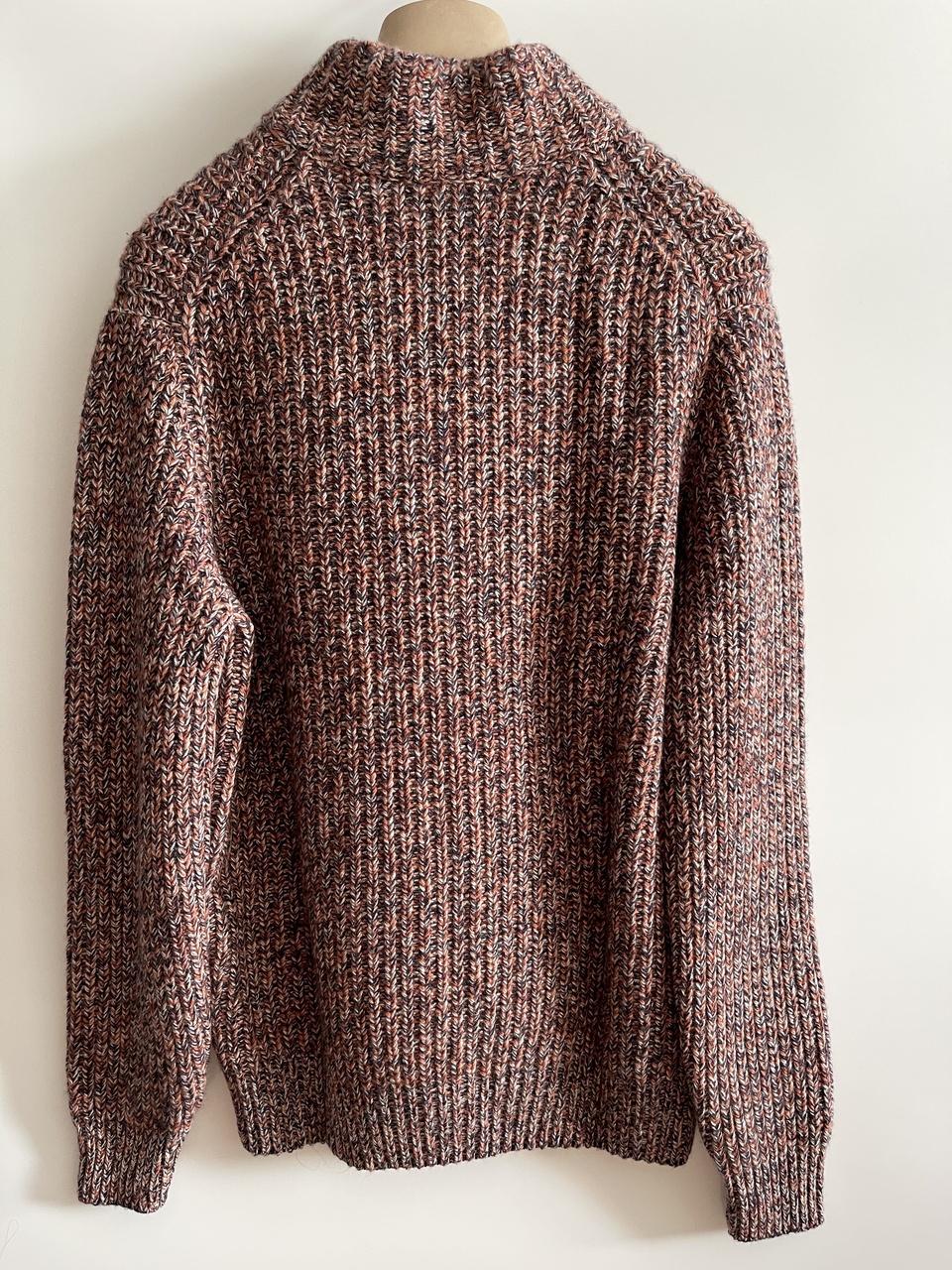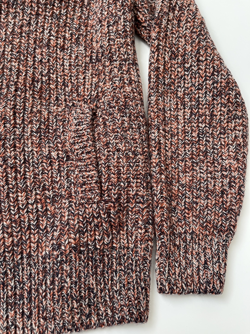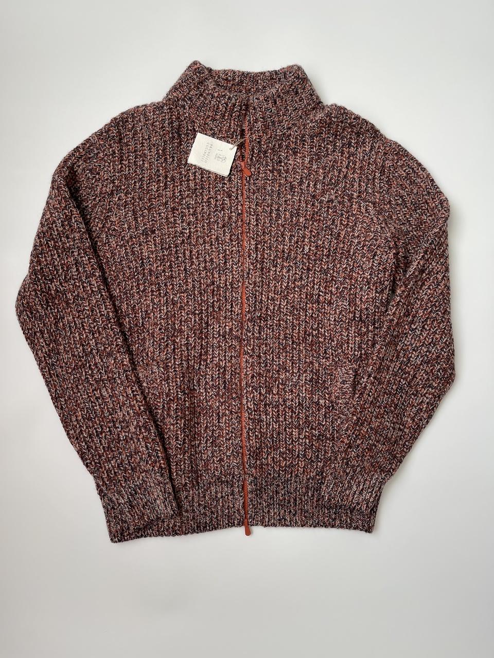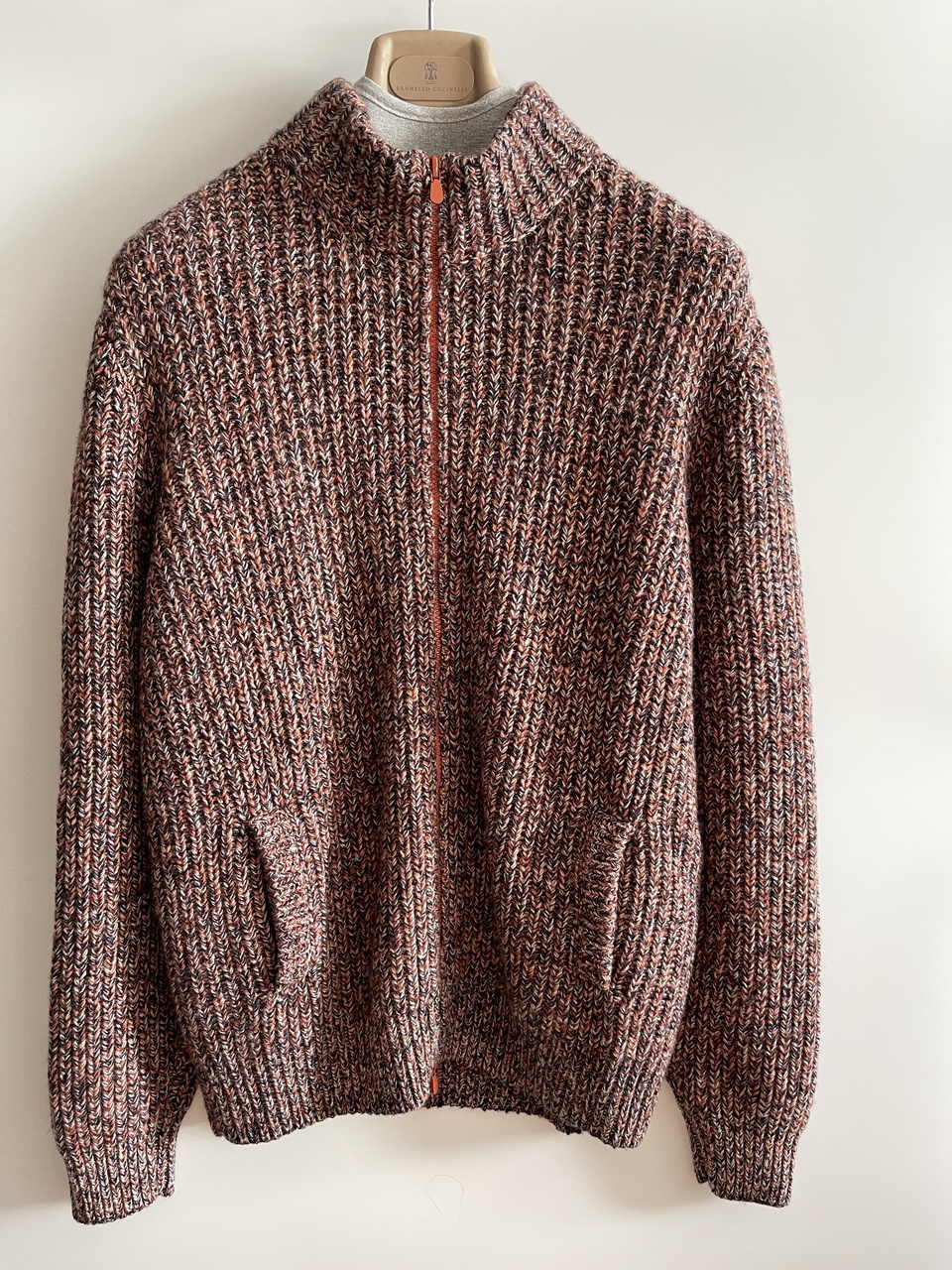 Современная техника вязки сочетается с традиционными трикотажными текстурами и ценными натуральными волокнами.Вязка полупатентной резинкой благородных волокон кашемира подчёркивает меланжевый эффект узорчатой пряжи.Окрашенные в разные оттенки нити создают особый меланжевый эффект,который выделяется на фоне классических линий кардиган.Высокий воротник, рукава реглан и застежка-молния с двойным бегунком завершают эту неформальную модель в спортивном стиле.
