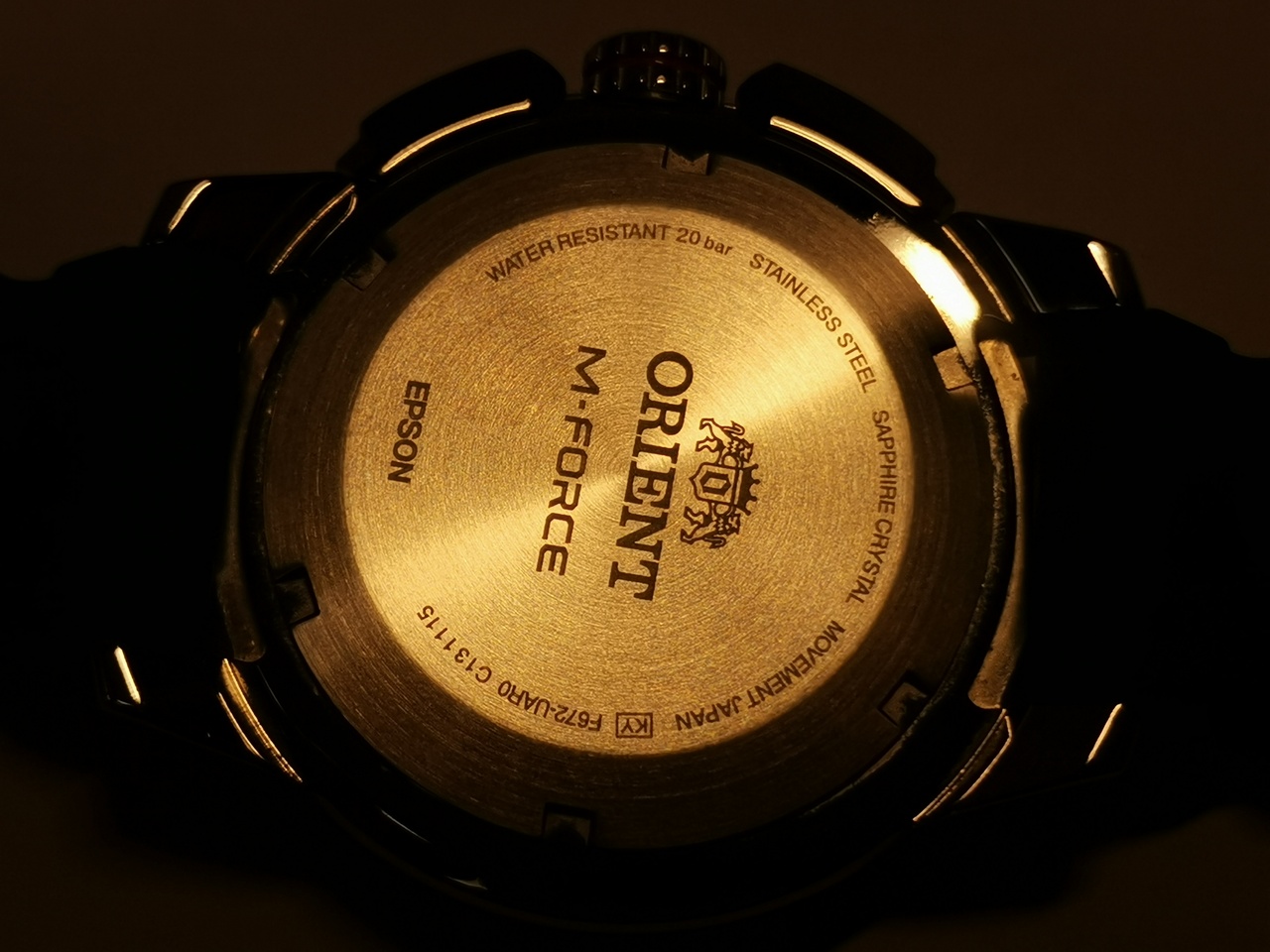 Задняя крышка завинчивающаяся, сатинированная по периметру, значительно приподнятая в центральной части. На поверхности крышки неглубокой гравировкой нанесены надписи: Orient, M-Force, EPSON, water resistant 20 bar, stainless steel, sapphire crystal, movement japan, F672-UAR0 C131115.