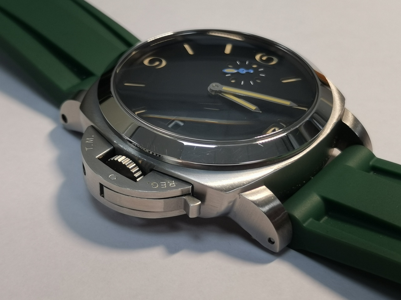 Поскольку я так или иначе начал рассказывать о часах, то всё таки расскажу чем они мне понравились. В первую очередь это стрелки. Гармоничной длины и ширины, простые мечевидные, никелированные, с наполнением люминофором в центральной части. Люминофор не яркий, но светит довольно продолжительно. Мне понравился цвет люминофорного состава, он зеленовато-бежево-серый, очень винтажный. Циферблат сэндвич тоже неплох, с люминофором того же цвета, что и на стрелках, однако светит поярче и подольше. Поле циферблата черного матового цвета с аккуратными вырезами под часовые метки. У меня есть псевдопам от Сан Мартина, со схожим циферблатом, и с более богатой окраской, однако этот мне нравится больше, так как все часовые метки наблюдаются полноценно без искажений. Безель ровный, классический, полированный, придраться практически не к чему, разве что на нем видны отпечатки пальцев и микроцарапины как результат эксплуатации часов. Стекло минеральное, полукупольное, довольно неплохое, правда, бликует. Корпусу я выше уделил достаточно внимания, поэтому, только сообщу его габариты: диаметр 44мм, диаметр с заводной головкой и запорной скобой 50мм, от ушка до ушка 54мм, между ушек 24мм, толщина корпуса 16мм.