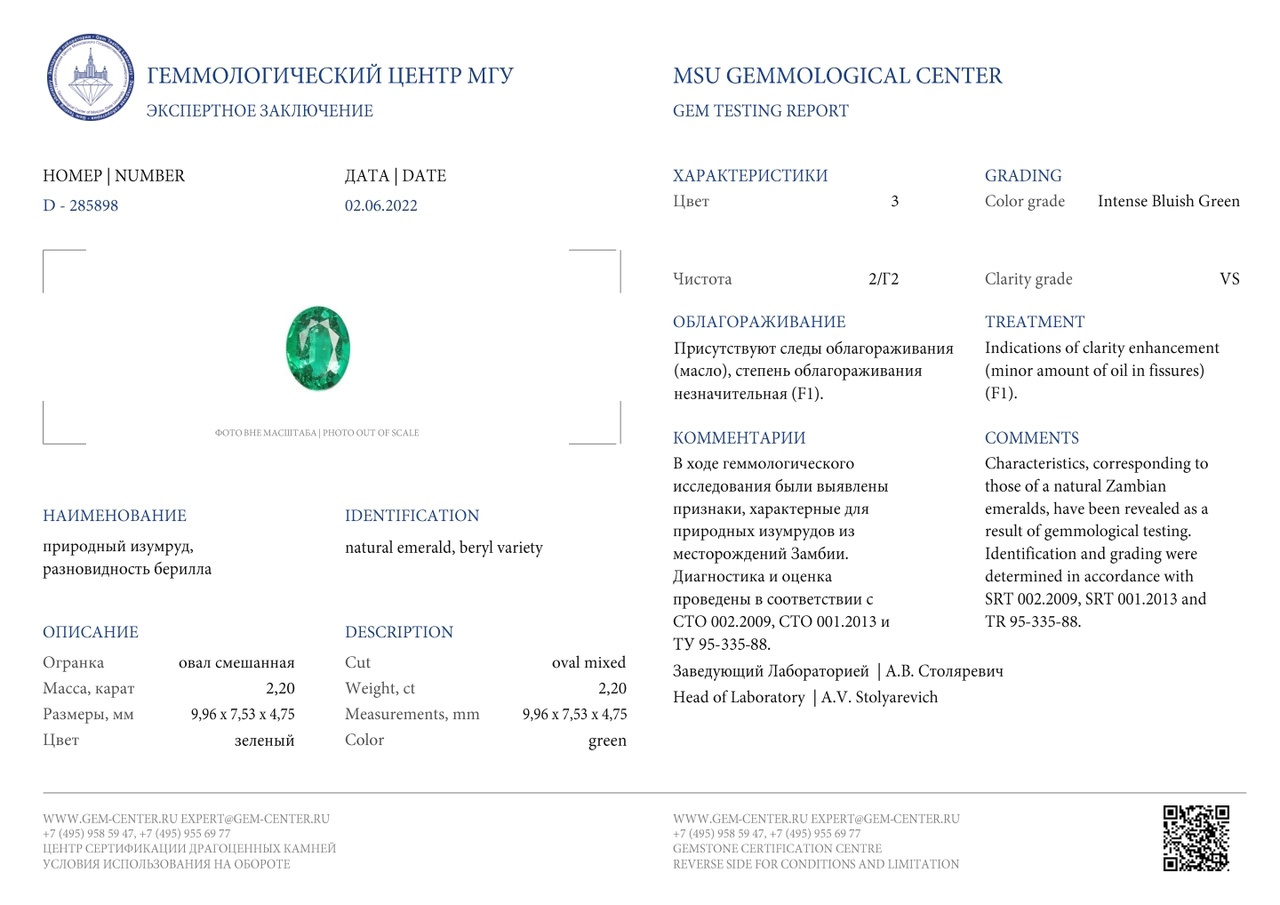 Изумруд весом 2,2 карат, природный, метод облагораживания - промасливание