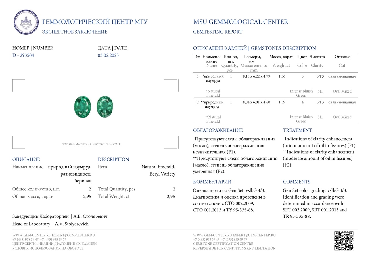 Изумруды общим весом 2,95 карат, природные, метод облагораживания - промасливание