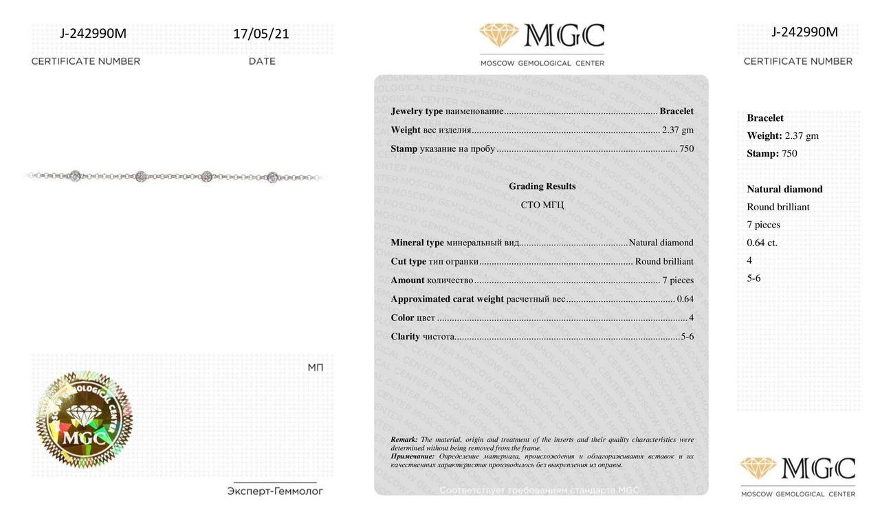 Браслет из белого золота с бриллиантами 0,64 карат (сертификат МГЦ)