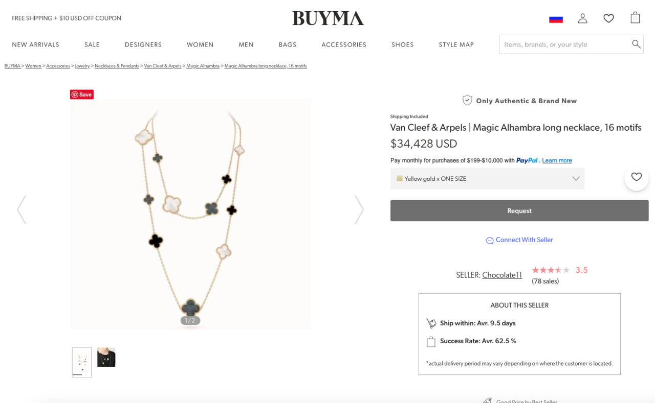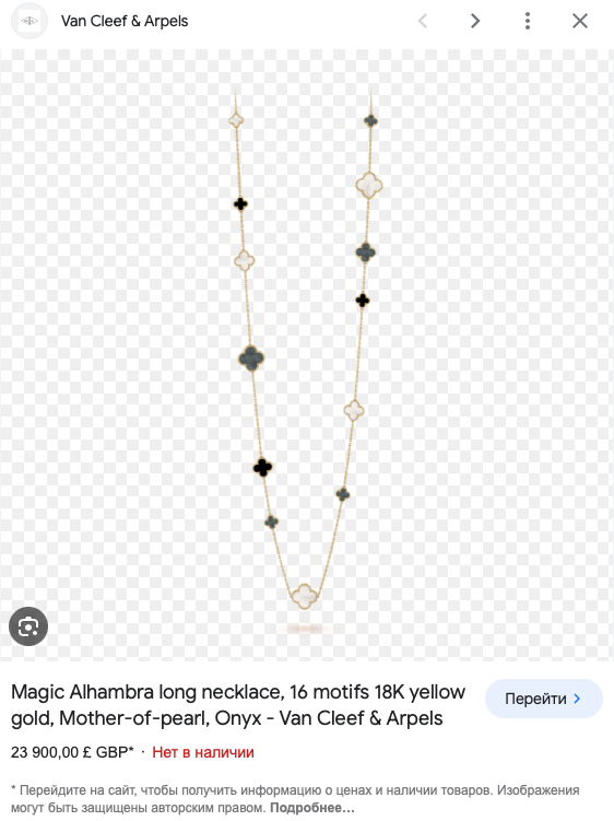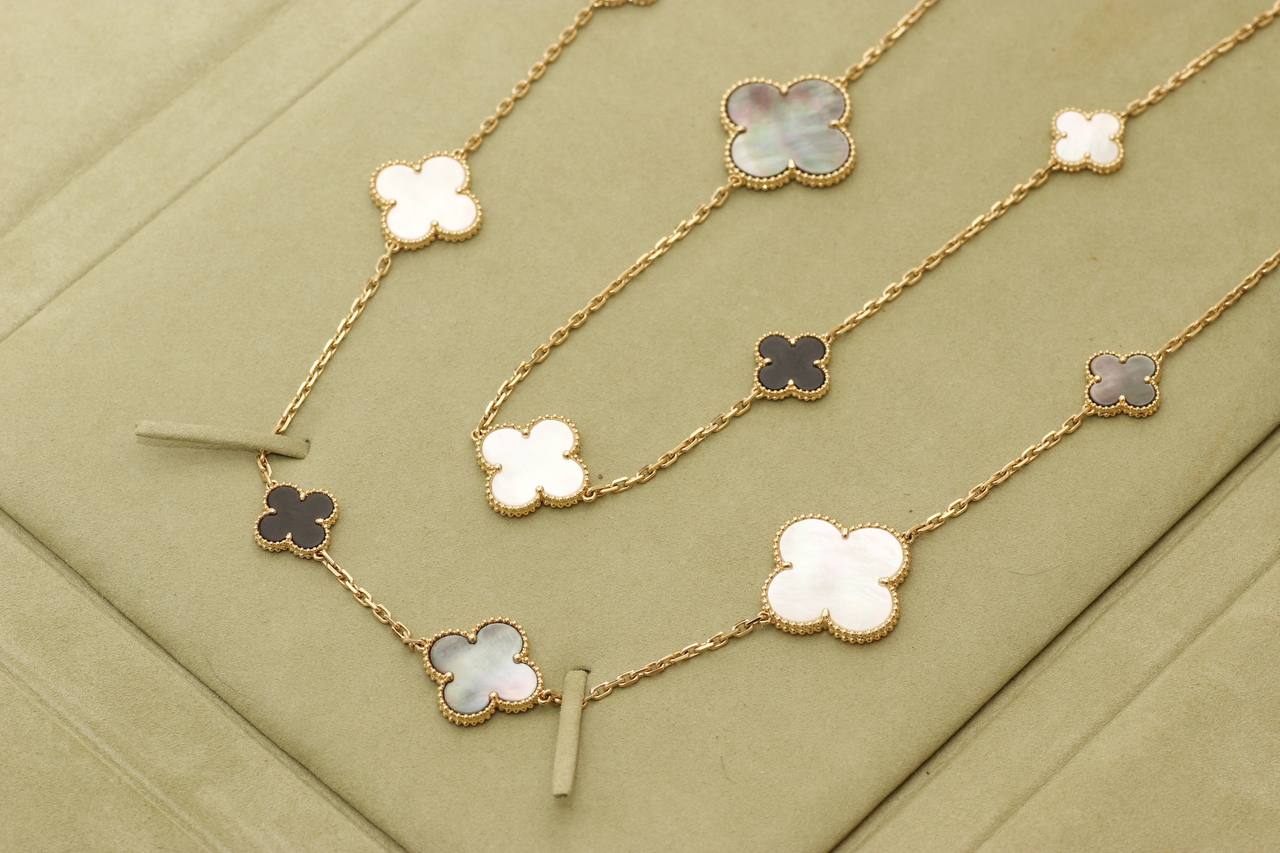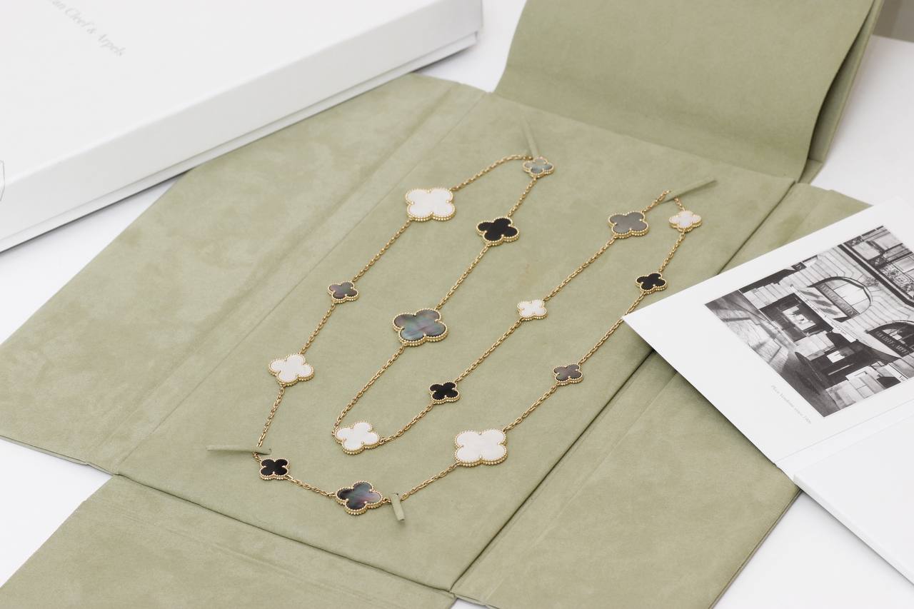 VAN CLEEF & ARPELS ДЛИННОЕ КОЛЬЕ MAGIC ALHAMBRA VCARD79400 16 мотивов, желтое золото 750 пробы, белый и серый перламутр, оникс.