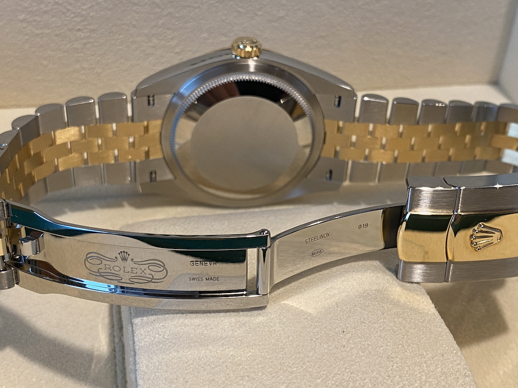 Великолепная возможность приобрести одну из самых популярных разновидностей биколорного ДДж 36. Предлагается модель из стали и жёлтого золота с практичным рифлёным безелем и красивейшим циферблатом золотистого цвета с резным декором, на браслете Джубили. Универсальные часы хороши не только для ежедневной носки, но и вполне подходят для торжественных случаев.