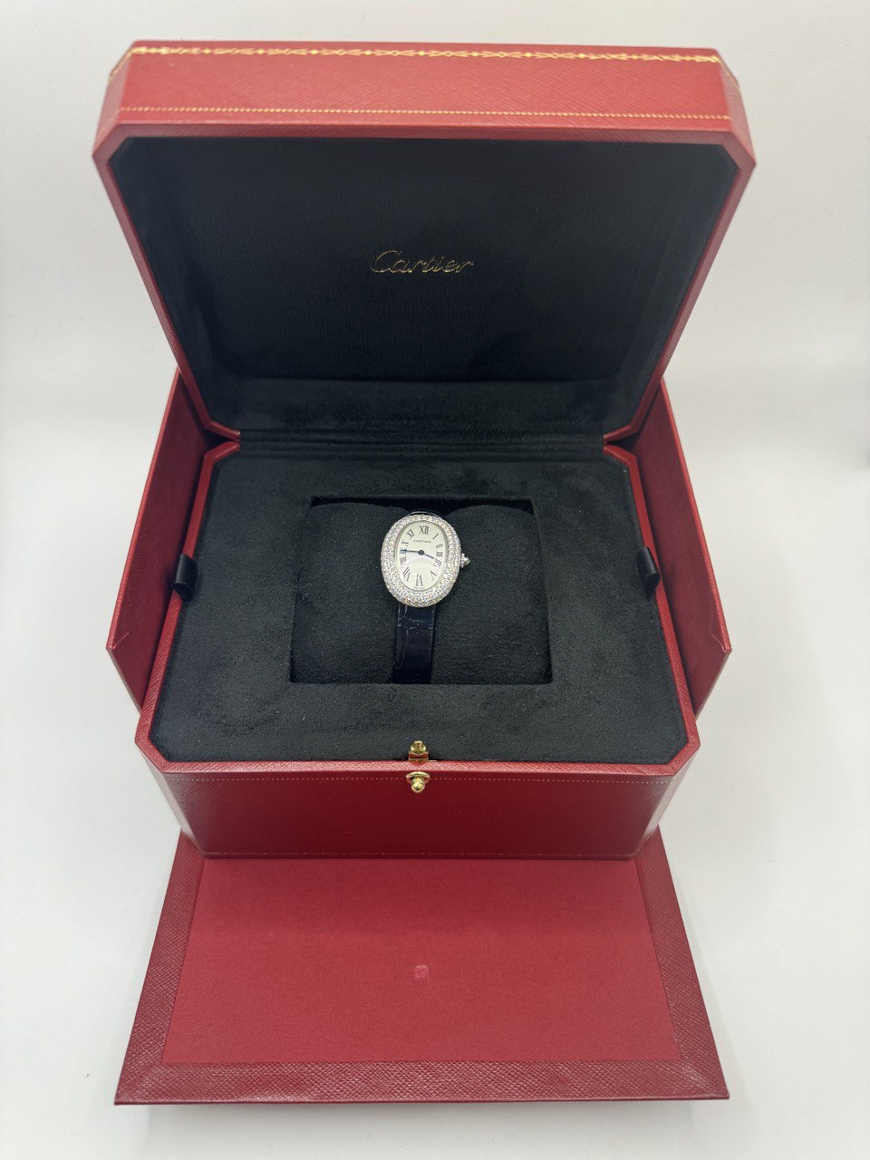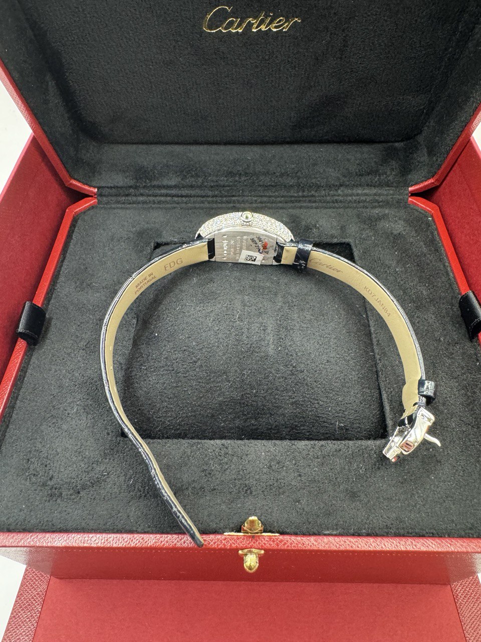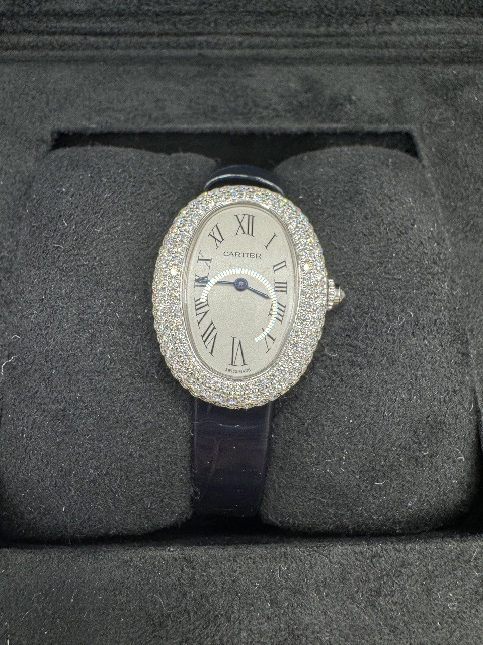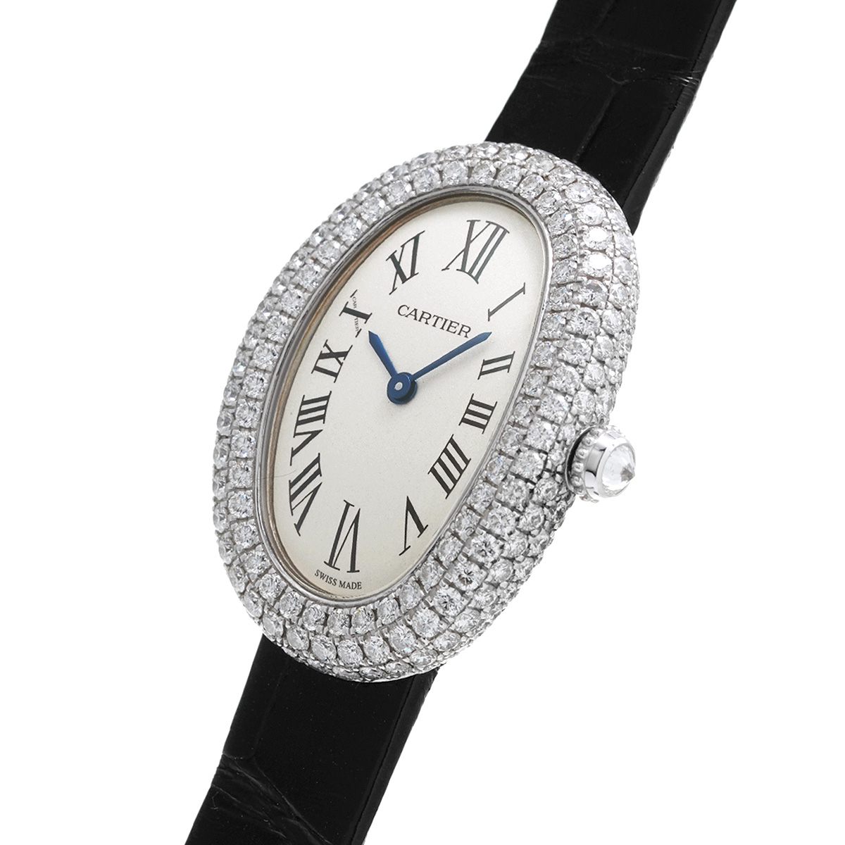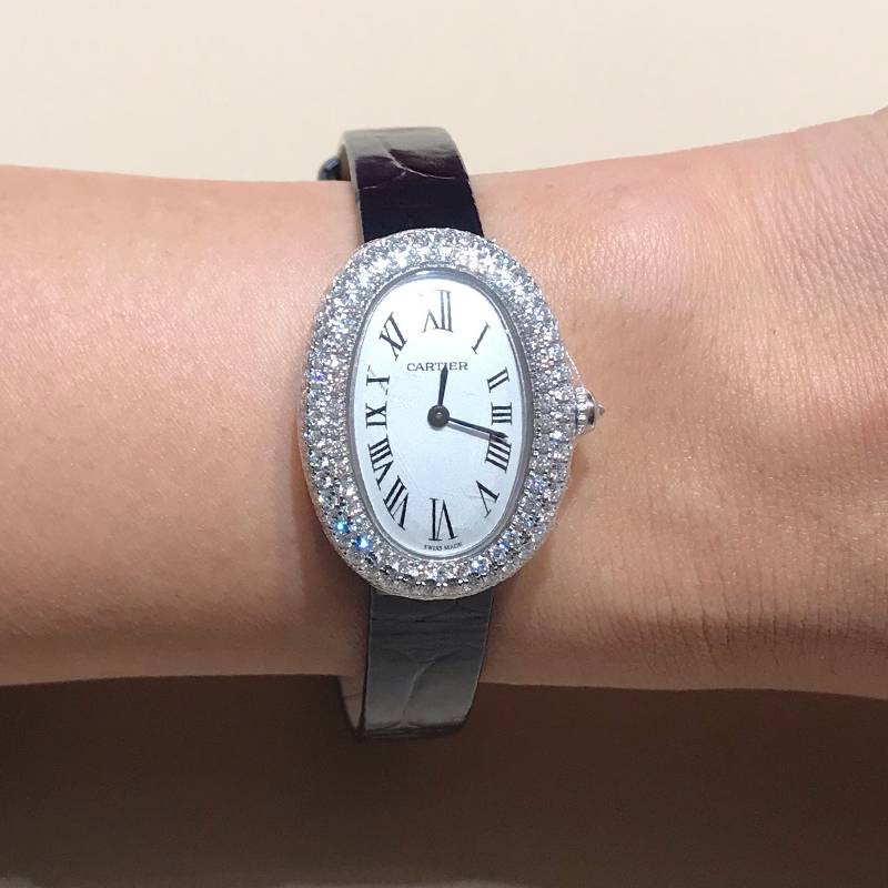 Корпус из белого золота украшен бриллиантами, размером 32*26 мм.