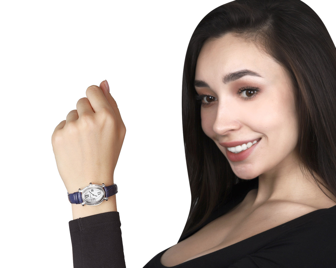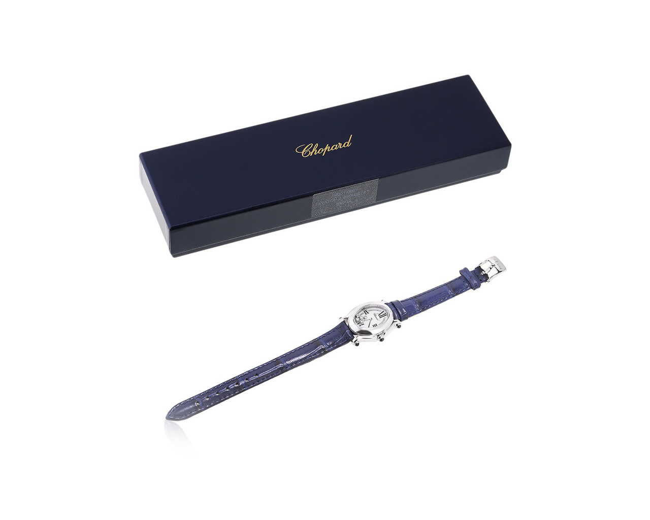 Оригинальные золотые часы с бриллиантами 0.10ct и сапфирами 0.75ct от всемирно известного бренда Chopard из коллекции Happy Sport Oval.