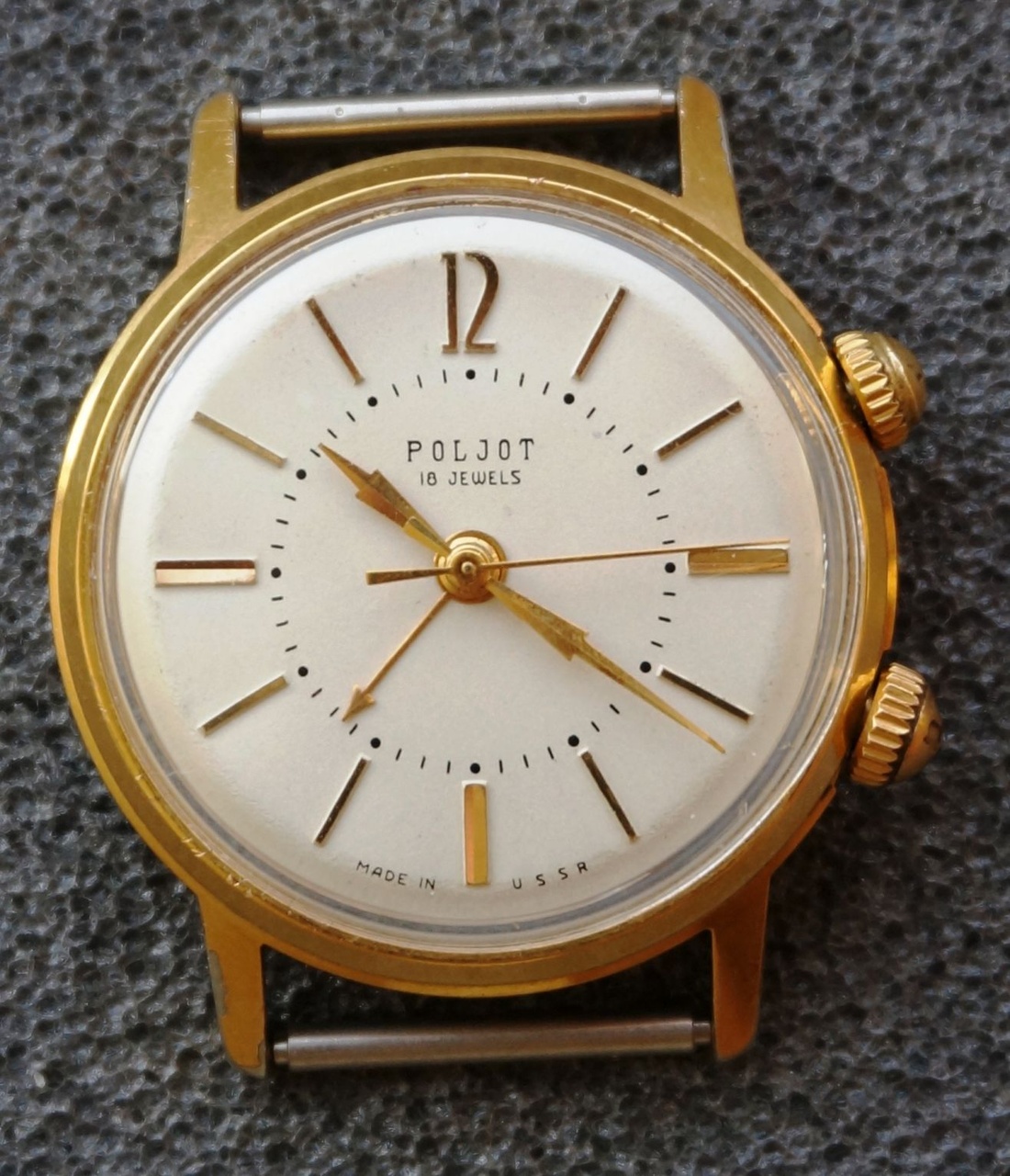 Полет который справа. Смущает, что циферблат с позолоченными делениями, цифрами, стрелками и заводными головками сидят в хромированном корпусе. Может ли так быть или должен быть и позолоченный корпус у них? И еще стрелка будильника не должна ли то же быть позолоченной?