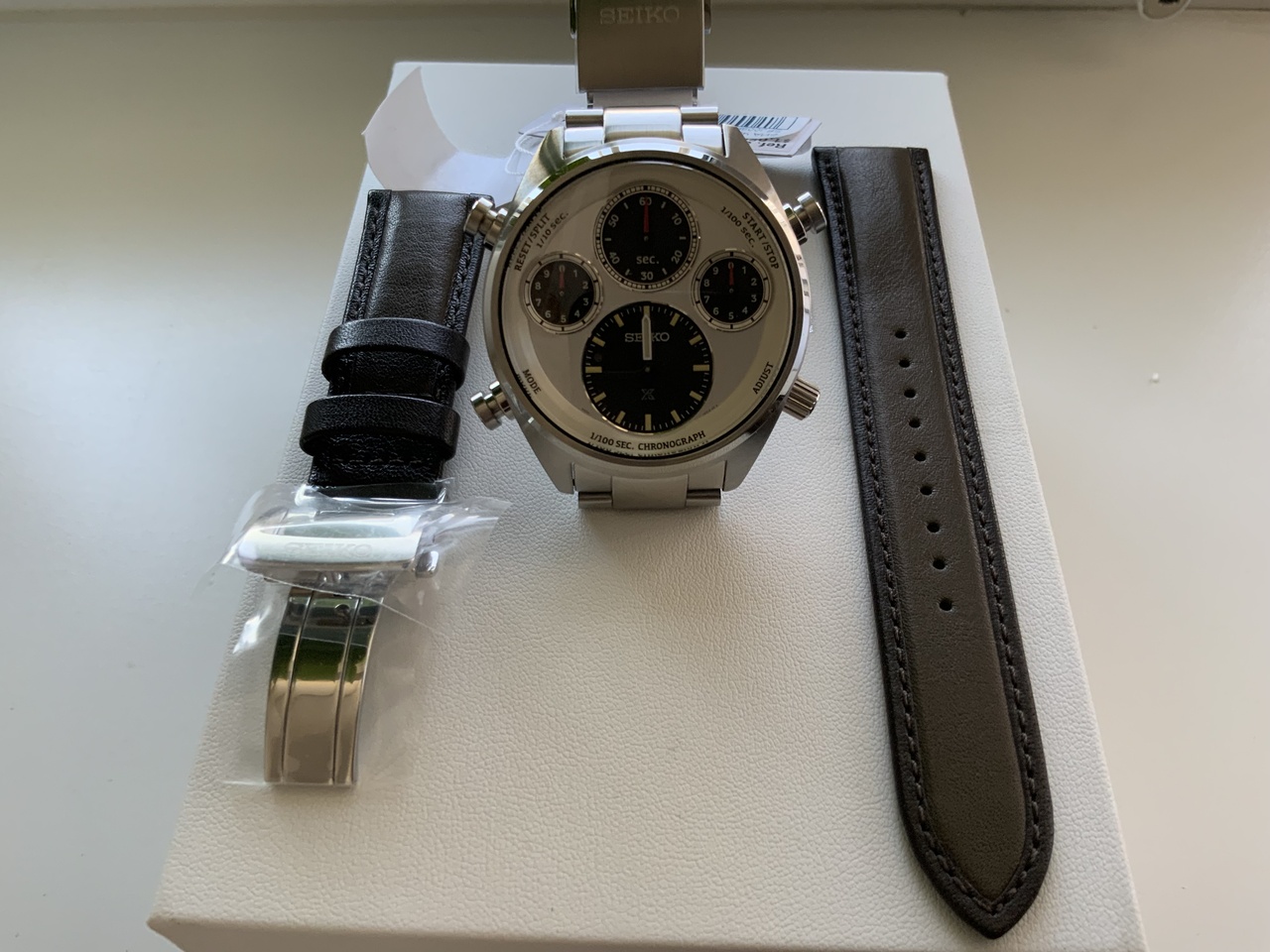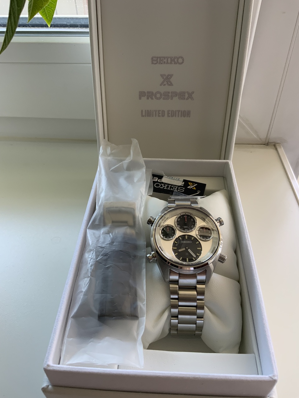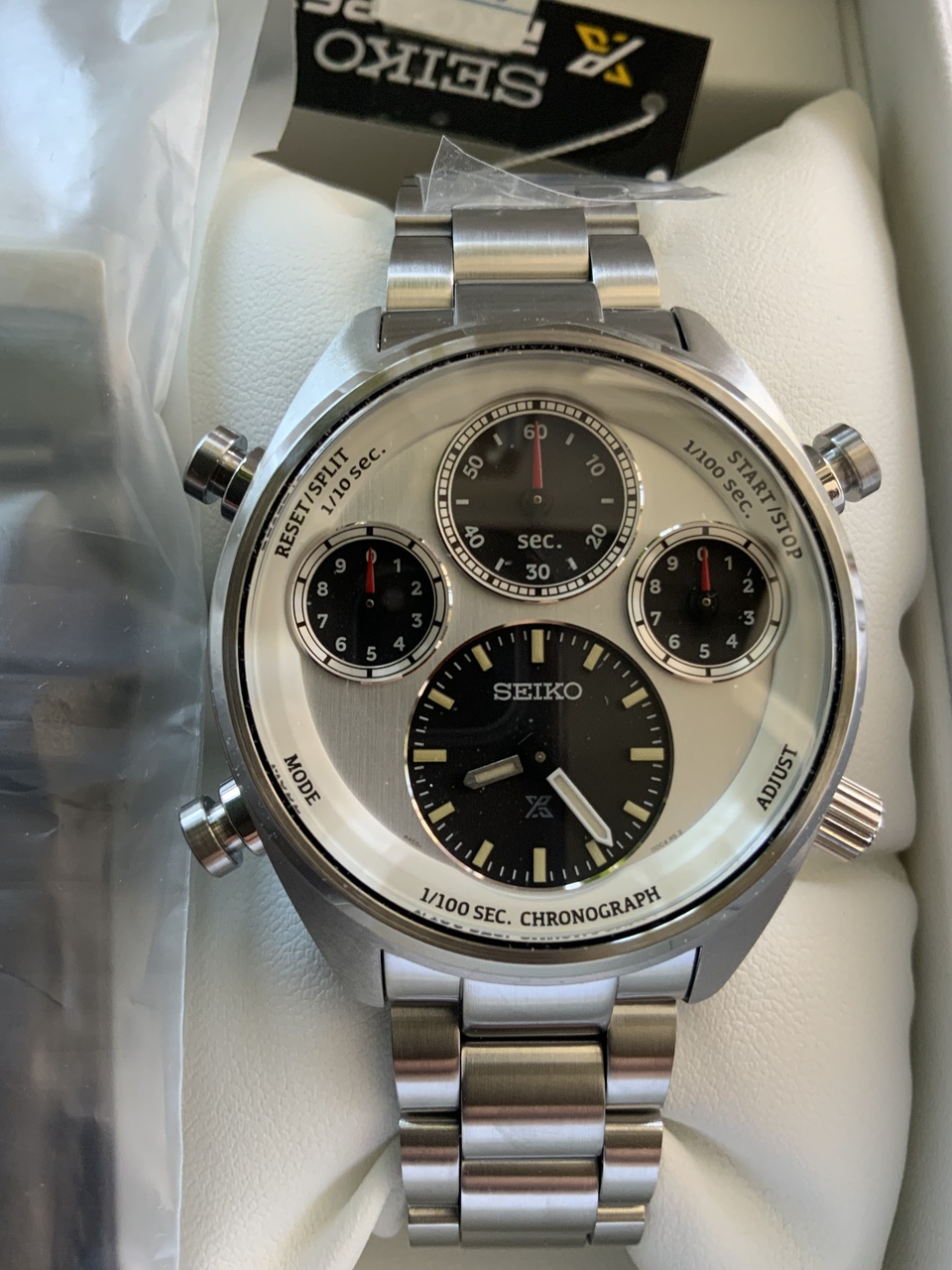 Мою коллекцию пополнил Seiko Prospex SFJ009P1 Limited Edition, посвященный 110-летнему юбилею, и имеющий ограниченный выпуск, спидтаймер с механизмом, способным отмерять интервалы до 1/100 секунды. Модель выпущена к юбилею первых наручных часов Laurel, произведенных в Японии компанией Seiko 110 лет назад. Они также имели белый циферблат и кожаный ремешок. Но современные часы лишь отдаленно напоминают ту легендарную модель.