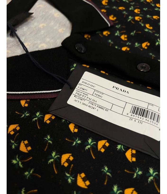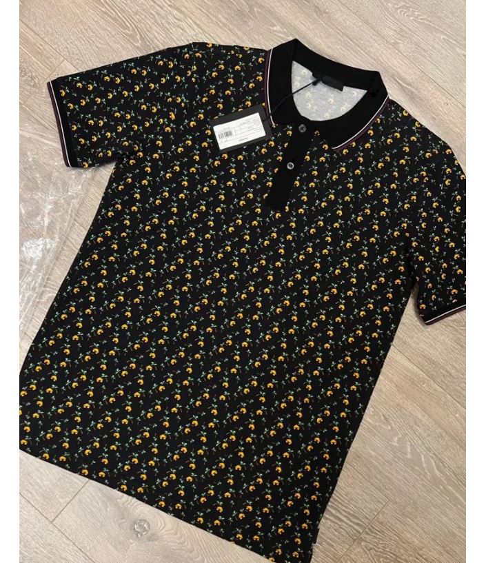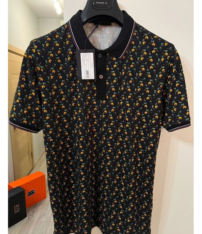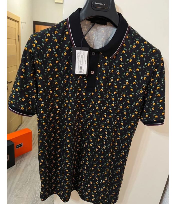 Поло PRADA //новое с бирками//классическое хлопковое пике//черное с желтым, летним принтом//размер 48-50