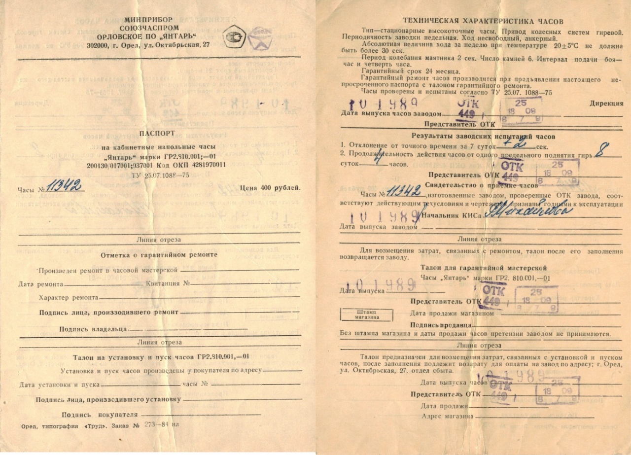 Паспорт Янтарь (четвертной репетир, напольные)