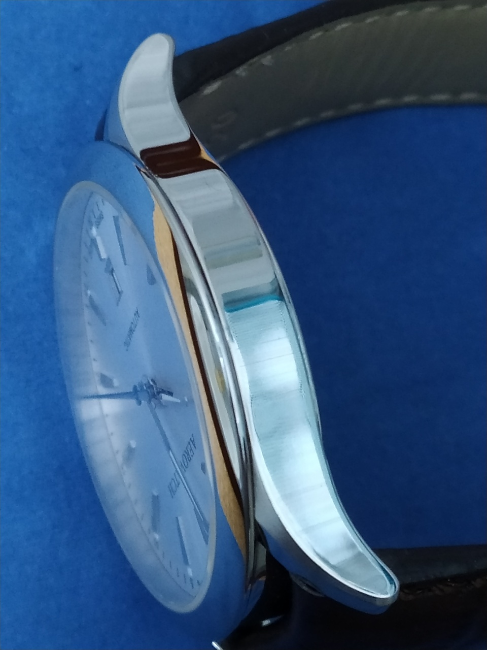 - Поверхность стального цвета, «переливающегося» на свету; накладные часовые стальные метки; часовые и минутные стрелки, и точки, отмечающие час – покрыты люминисцентным составом; окошко даты на 6 часов.