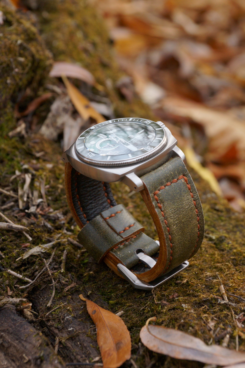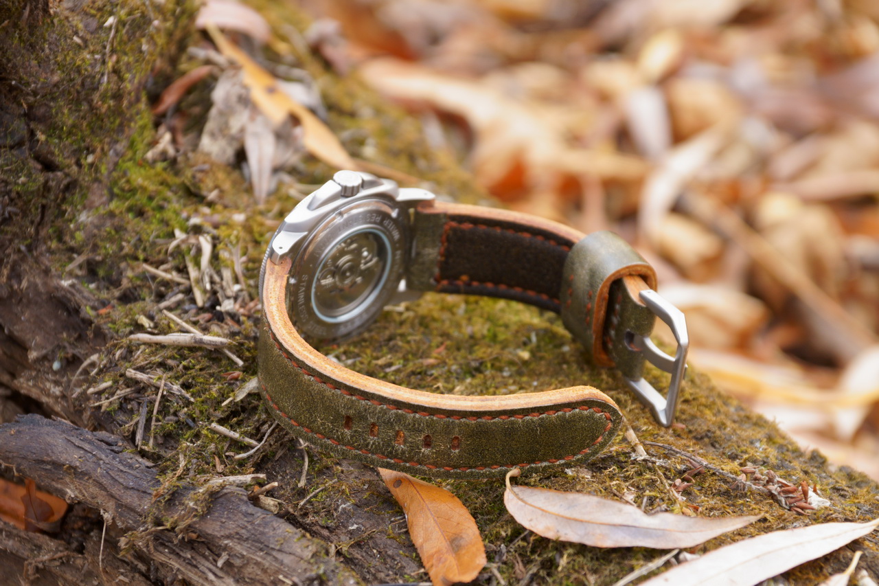 Есть, конечно и некоторые детали внешнего вида часов, которые можно было бы сделать лучше. Главная претензия к производителю, это не попадание в цвет вставки безеля и цвета циферблата. В общем всё можно назвать зеленым, но, например вставка безеля из керамики имеет ровный теплый зелено-серый цвет, напоминающий окись хрома. Поле циферблата имеет градиентную окраску от интенсивно изумрудного, до темно-травяного, почти черного. Стрелки широкие, это хорошо, но скелетизированные. При свете определить время не представляет труда, однако в темноте заполненные люмом кончики стрелок создают некую «мешанину» световых точек, с часовыми обозначениями различной геометрии, среди которых определить где и что находится, моментально не получится. И, наконец самый заметный недостаток этих часов (хоть и исправляемый) это текстильный ремешок. Он изготовлен из синтетических нитей защитного зеленого цвета, плетения вполне симпатичного, имеет прострочку по обеим сторонам белыми нитками в три ряда. Особенность ремешка в том, что он охотно намокает при контакте с водой, но правда, довольно быстро высыхает. Недостатком ремешка я считаю его способность ворситься, и чем дольше носится ремешок, тем больше ворсинок на нем образуется, - вероятно от контакта с различными поверхностями перетираются нити, - в первую очередь по краям ремешка.