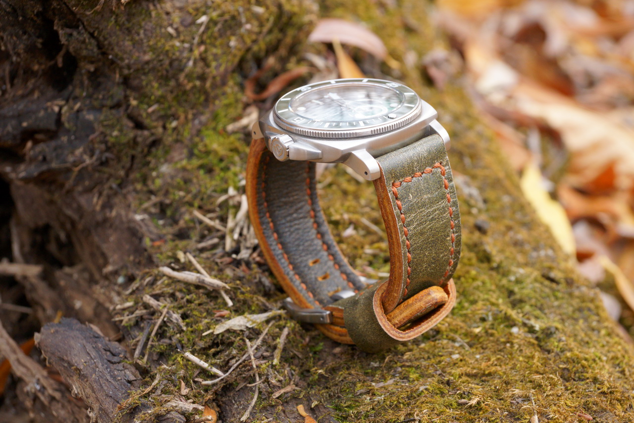 Ремешок часов на 24мм, текстильный, зеленого защитного цвета, имеет прострочку по периметру белыми нитками в 3 ряда. Перфорированные отверстия усилены вставкой из кожзама зеленого цвета. Оборотная сторона ремешка имеет слой «подкладку» из кожзама черного цвета. На кожзаме тисненые надписи: Genuine Leather, Pagani Design, логотип бренда.